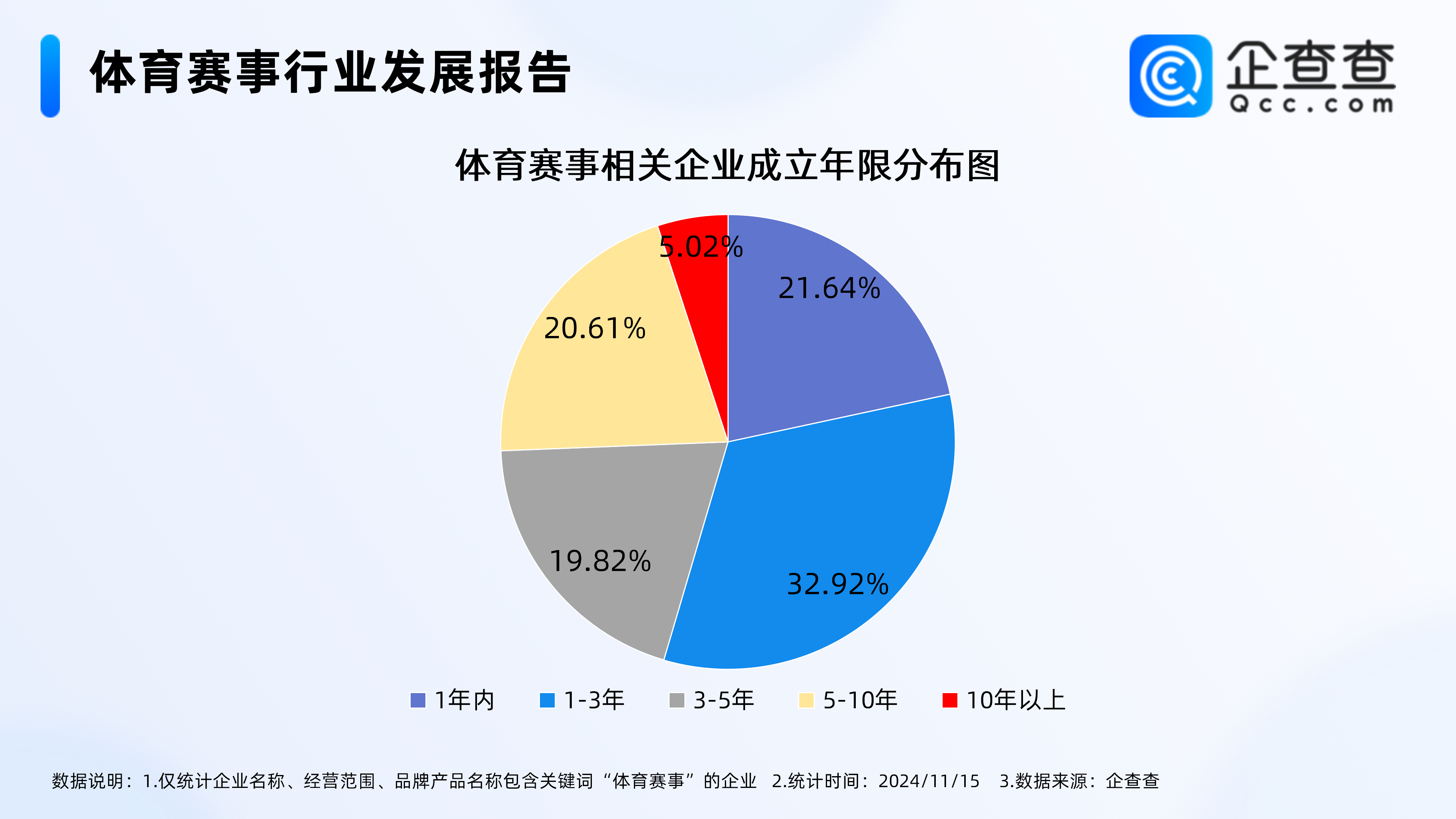 企查查數(shù)據(jù)顯示,在體育賽事相關(guān)現(xiàn)存企業(yè)中,成立年限在3年內(nèi)的企業(yè)占比過半,達54.56%,其中成立年限在1-3年的企業(yè)占比最大,為32.92%,成立年限在1年內(nèi)的企業(yè)占比21.64%。