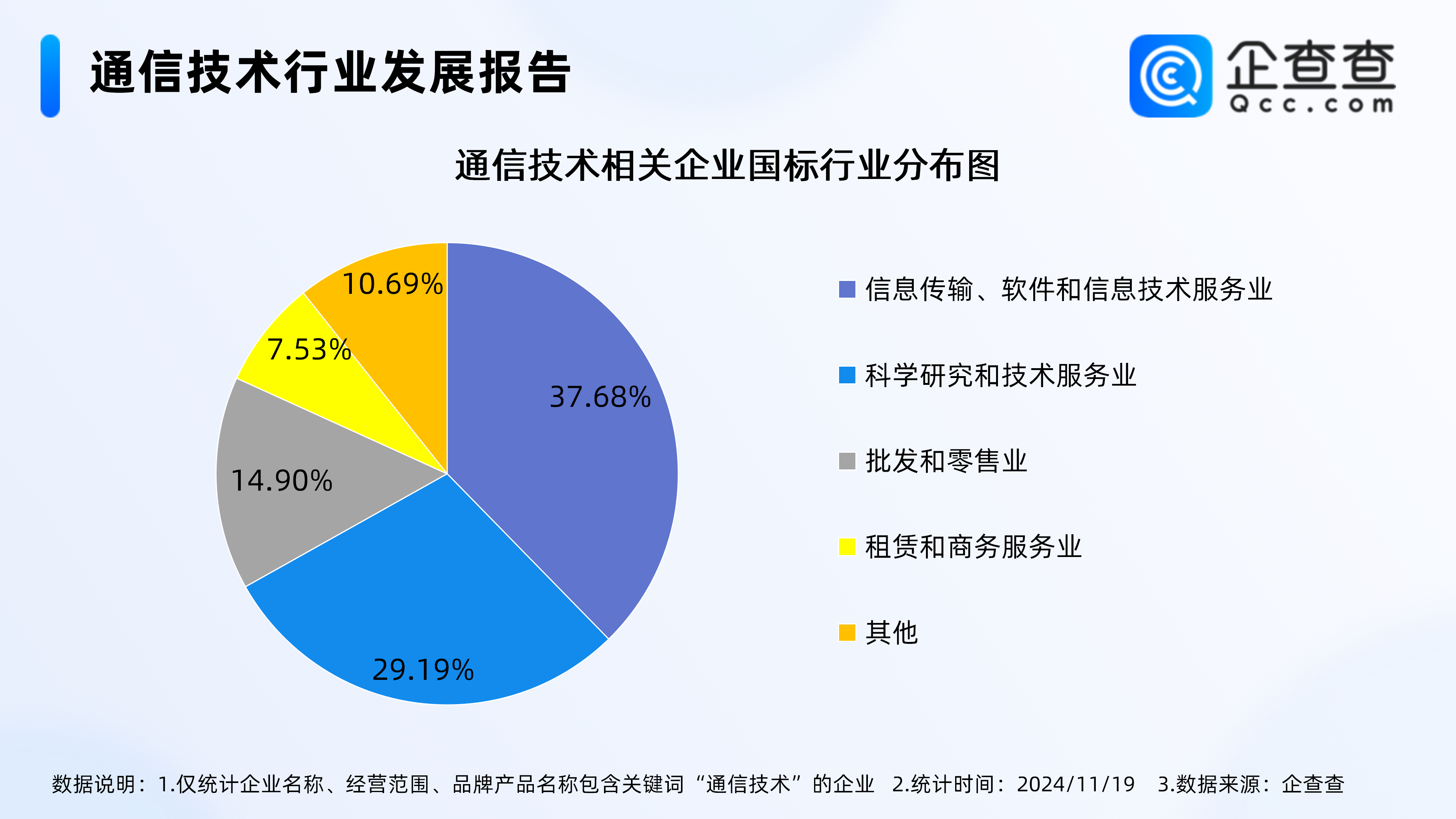 企查查數據顯示,從國標行業的分布來看,通信技術相關現存企業多屬技術密集型企業。其中分布在信息傳輸、軟件和信息技術服務業的企業占比37.68%,分布在科學研究和技術服務業的企業占29.19%。