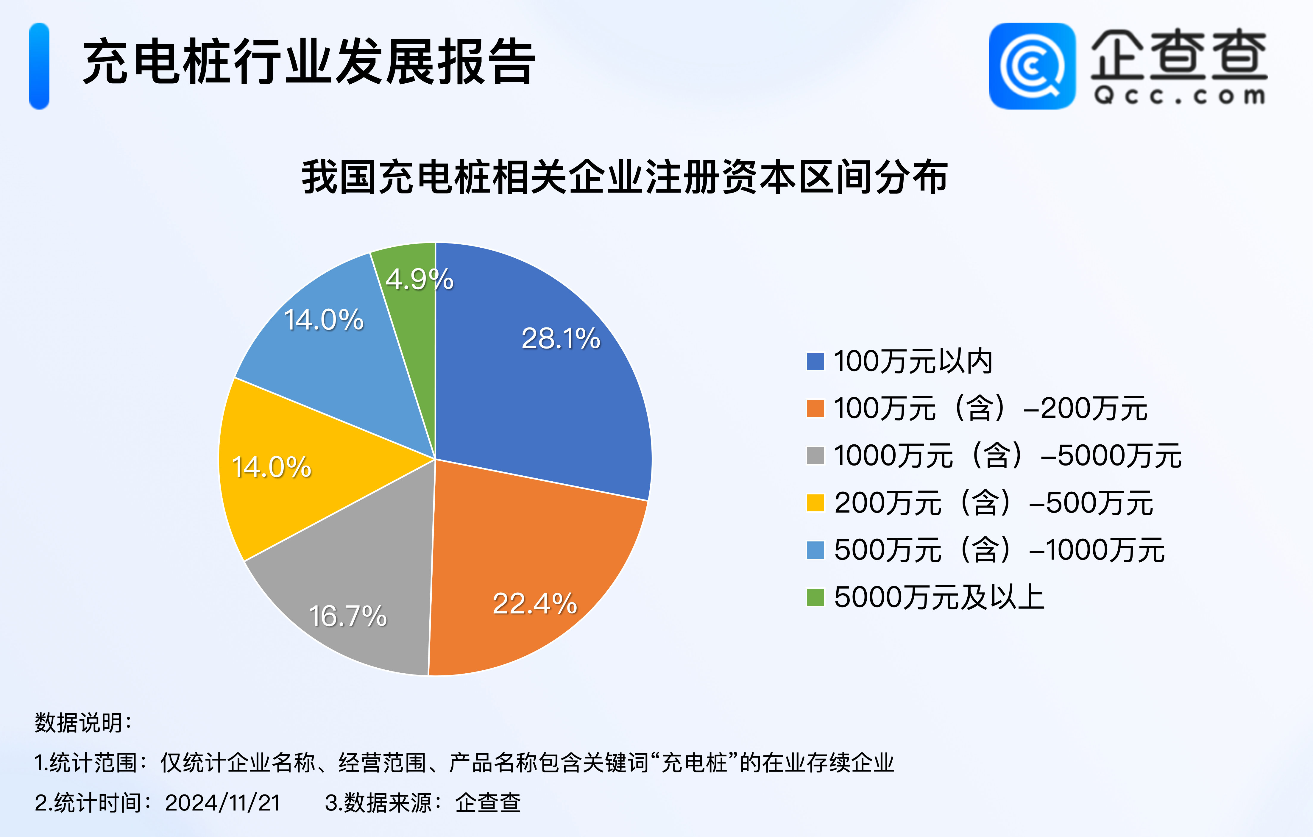 企查查數據顯示,公示注冊資本的充電樁現存企業中,注冊資本區間分布相對均衡,其中注冊資本在100萬元以內的企業最多,占比28.1%,注冊資本在100萬元-200萬元的企業,占比22.4%,即注冊資本在200萬元以內的企業占比超五成,我國充電樁行業正處于快速發展階段。