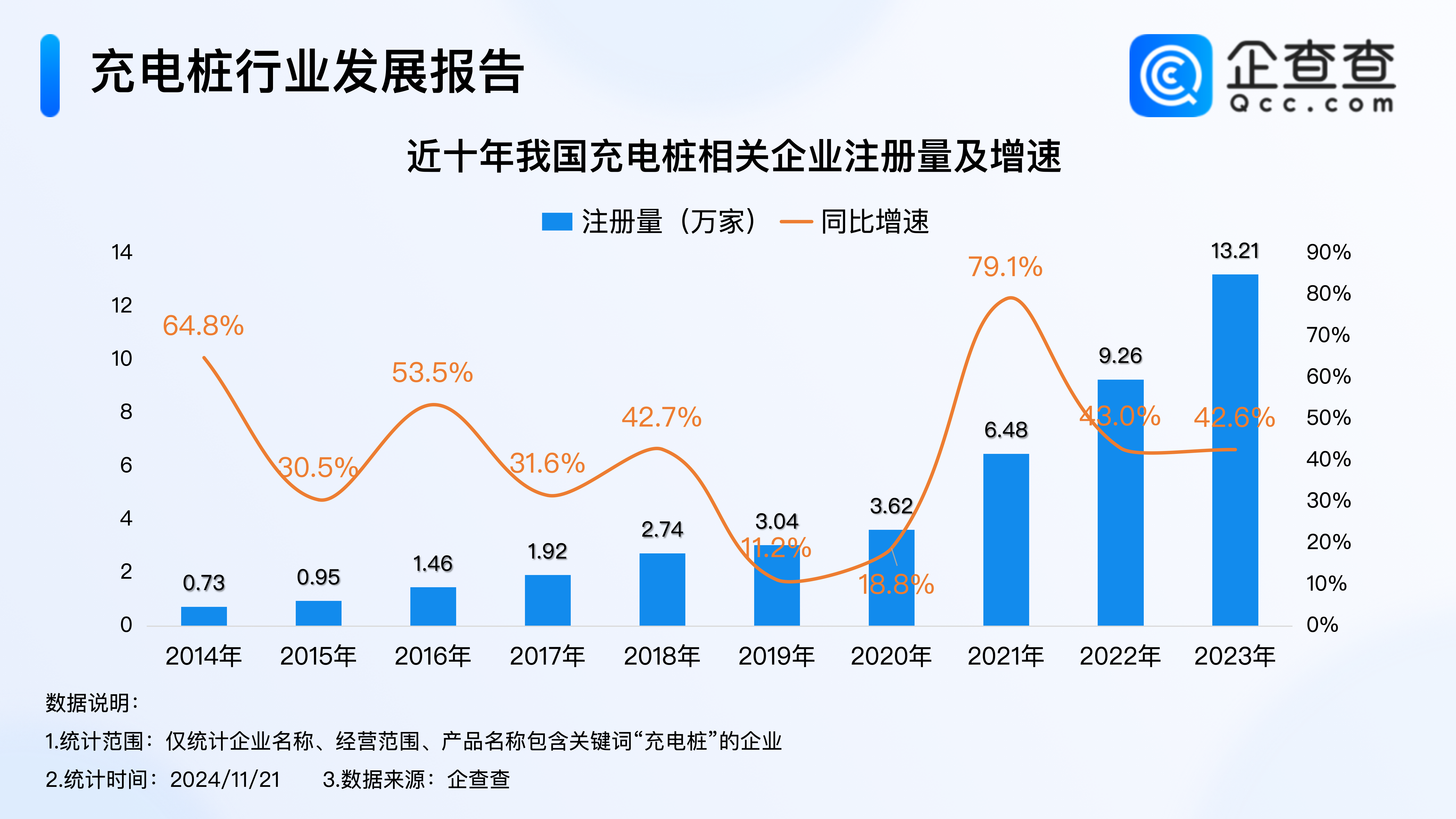 企查查數據顯示,近十年,我國充電樁相關企業注冊量逐年增加,且2021年開始增速加快。2021年我國充電樁相關企業注冊量同比大幅增加79.1%至6.48萬家,達近十年注冊量增速高峰,2022年相關企業注冊量同比增加43.0%至9.26萬家,2023年,我國充電樁相關企業注冊量首次突破10萬家,全年注冊量同比增加42.6%至13.21萬家,創近十年注冊量新高。截至11月21日,2024年我國已注冊12.77萬家充電樁相關企業,相比2023年同期增加10.8%。