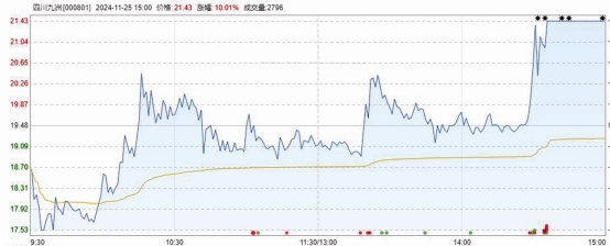 低空經(jīng)濟概念人氣股四川九洲(000801)25日早盤一度觸及跌停板,不過,午后公司股價突然快速上揚,并上演了“地天板”走勢,此前公司已經(jīng)連續(xù)5個交易日漲停。自11月18日以來,公司股價從12.09元/股漲至目前的21.43元/股,六個交易日漲幅高達77.11%。