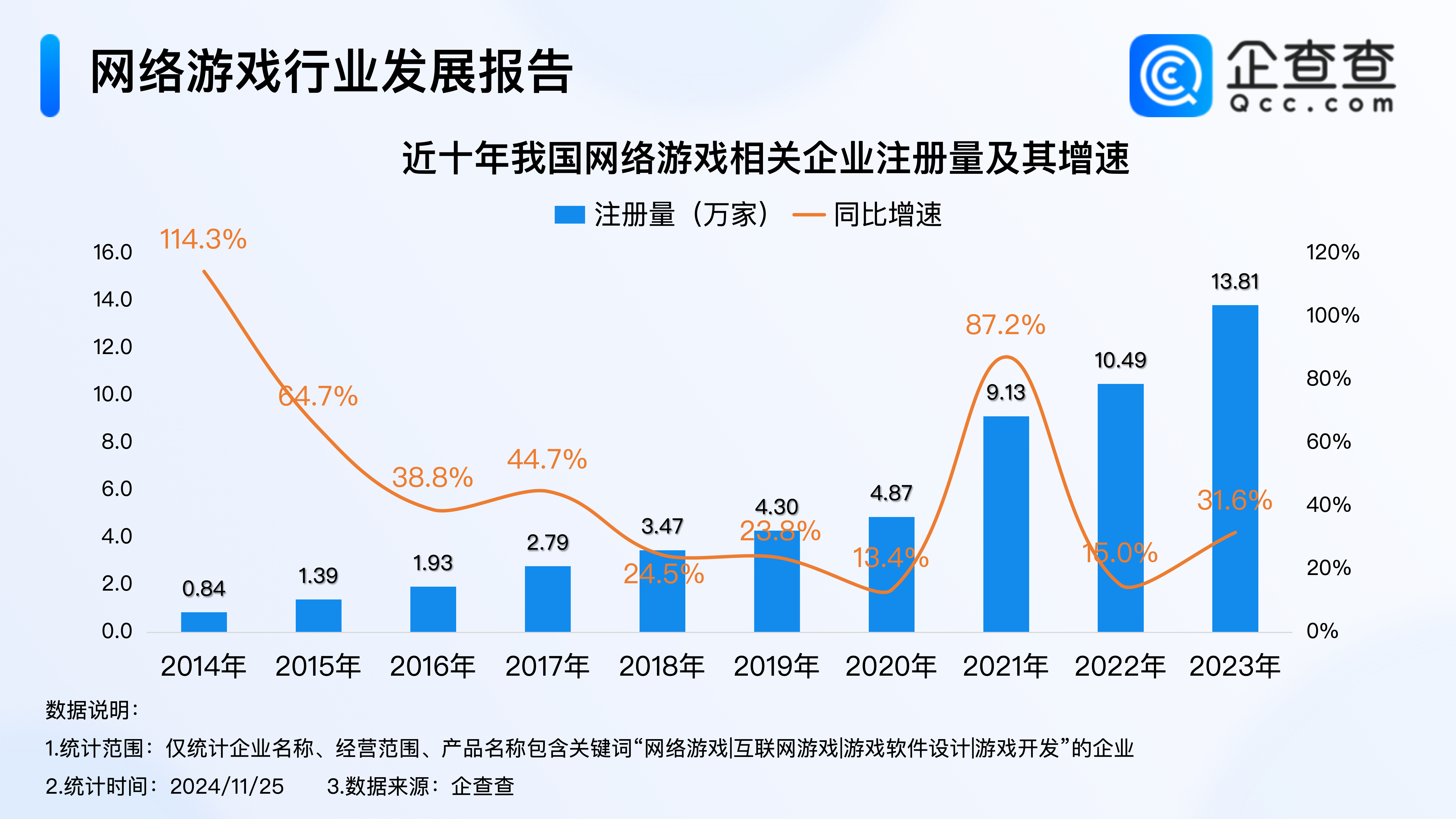 企查查數(shù)據(jù)顯示,近十年,我國(guó)網(wǎng)絡(luò)游戲相關(guān)企業(yè)注冊(cè)量逐年增加,尤其是2021年,全年注冊(cè)量同比增加87.2%至9.13萬(wàn)家,達(dá)近五年注冊(cè)量增速高峰;2022年,我國(guó)網(wǎng)絡(luò)游戲相關(guān)企業(yè)注冊(cè)量首次突破10萬(wàn)家,全年注冊(cè)量同比增加15.0%至10.49萬(wàn)家。2023年共注冊(cè)13.81萬(wàn)家網(wǎng)絡(luò)游戲相關(guān)企業(yè),同比增加31.6%。截至11月25日,2024年我國(guó)已注冊(cè)11.55萬(wàn)家網(wǎng)絡(luò)游戲相關(guān)企業(yè)。
