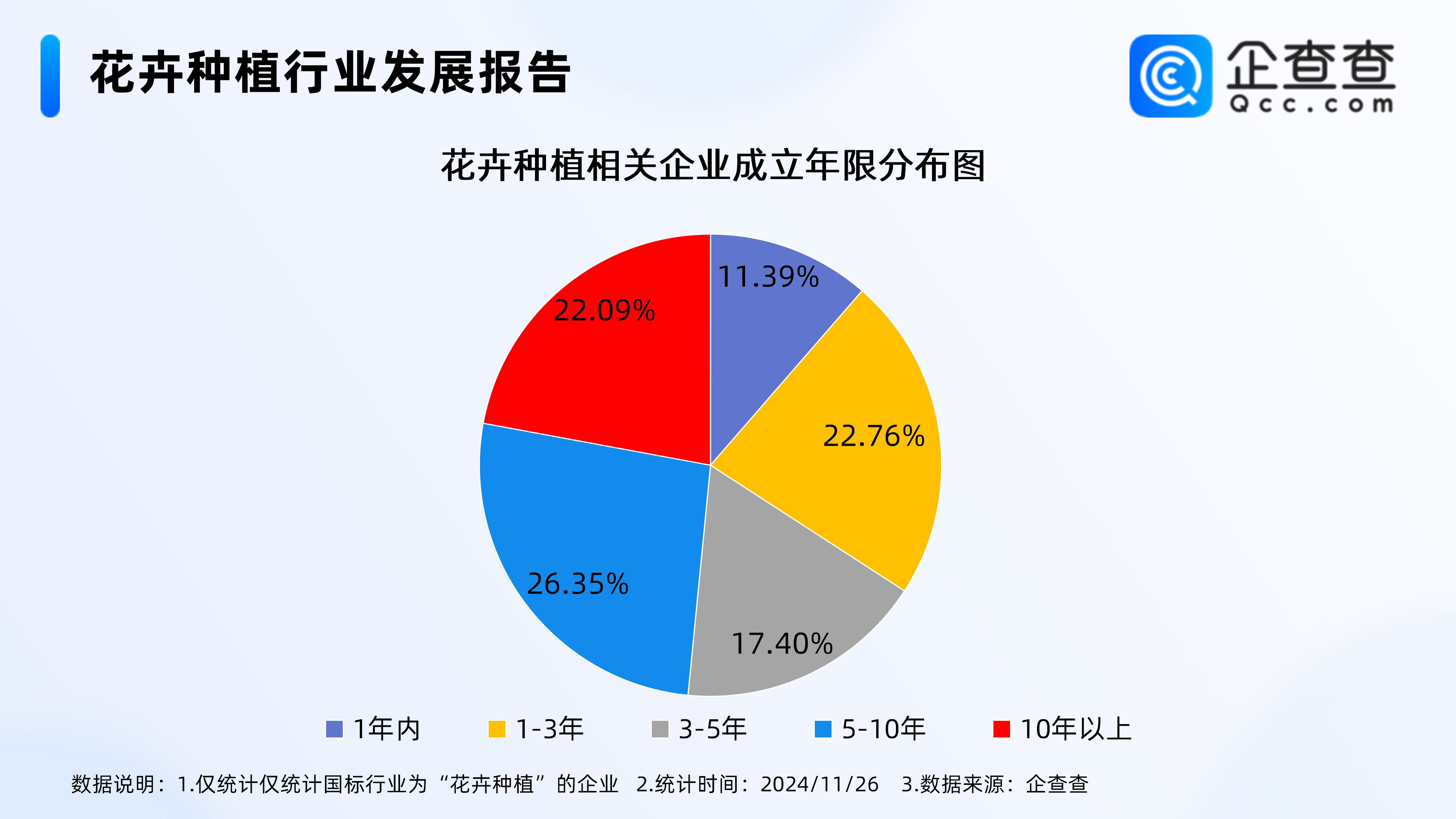 企查查數(shù)據(jù)顯示,現(xiàn)存花卉種植相關(guān)企業(yè)成立年限分布均勻,其中成立年限在5-10年的企業(yè)占比最大,為26.35%。其次,成立年限在1-3年、10年以上的企業(yè)分別占比22.76%、22.09%。