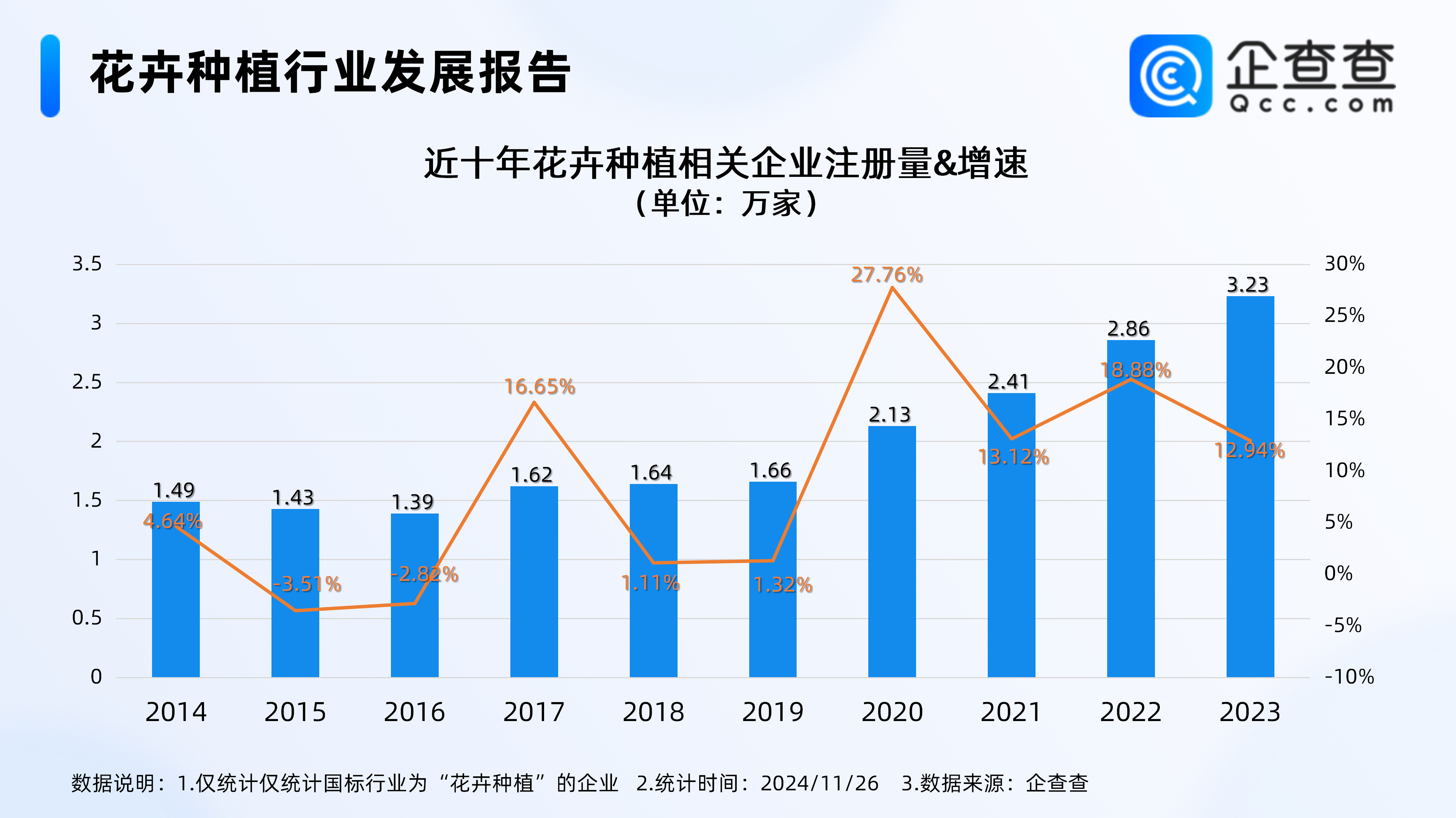 據(jù)央視財(cái)經(jīng)報(bào)道,今年前三季度,我國花卉進(jìn)出口貿(mào)易額超20億元。來自中國的玫瑰、馬蹄蓮、康乃馨等鮮切花,憑著高品質(zhì)和高性價(jià)比,贏得了越來越多日本消費(fèi)者的喜愛?;ɑ芟M(fèi)需求逐年增長(zhǎng),拉動(dòng)花卉產(chǎn)業(yè)不斷發(fā)展壯大,我國已成為世界最大的花卉生產(chǎn)國、重要的花卉貿(mào)易國和花卉消費(fèi)國。中國花卉協(xié)會(huì)統(tǒng)計(jì)數(shù)據(jù)顯示:我國花卉種植面積約150萬公頃,花卉從業(yè)人員超500萬人。 企查查數(shù)據(jù)顯示,國內(nèi)現(xiàn)存花卉種植相關(guān)企業(yè)20.95萬家。近五年相關(guān)企業(yè)注冊(cè)增長(zhǎng)速度明顯高于往期,2023年注冊(cè)量首次突破三萬家,全年同比增長(zhǎng)12.94%至3.23萬家花卉種植相關(guān)企業(yè),創(chuàng)近十年注冊(cè)量新高。截至目前,今年已注冊(cè)2.19萬家相關(guān)企業(yè)?,F(xiàn)存花卉種植相關(guān)企業(yè)成立年限分布均勻,其中成立年限在5-10年的企業(yè)占比最大,為26.35%。