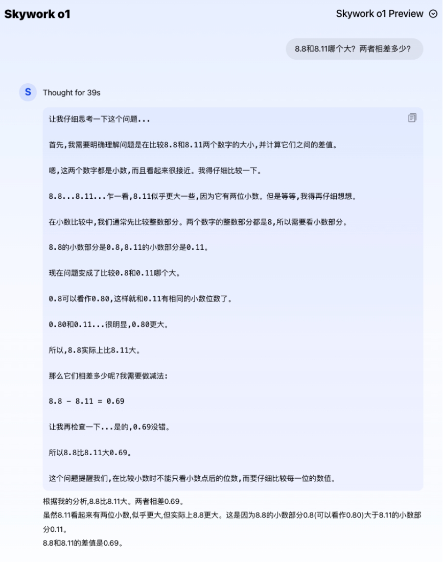 那么,之前大模型經(jīng)常翻車的比大小問題,Skywork o1現(xiàn)在的回答水平如何了?