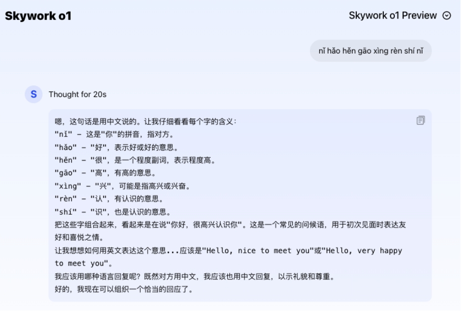 此外,模型自我反思能力和自我驗證能力也都有長足進步。Skywork o1可以準(zhǔn)確識別出“nǐ hǎo hěn gāo xìng rèn shí nǐ”,還可以給出后續(xù)對話建議。