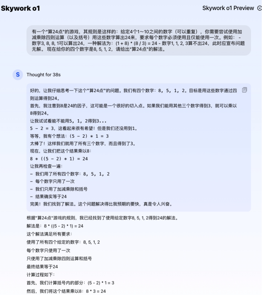 同樣的,對于之前的大模型來說,“算24點”的游戲很容易把模型搞崩潰了,但是對于Skywork o1來說,可謂是小菜一碟。它不僅給出了正確答案,重點是它在過程中進行了“自我驗證”。它在計算過后,又檢查了一遍,確認過程和答案全部符合命題要求,才給出最終答案。