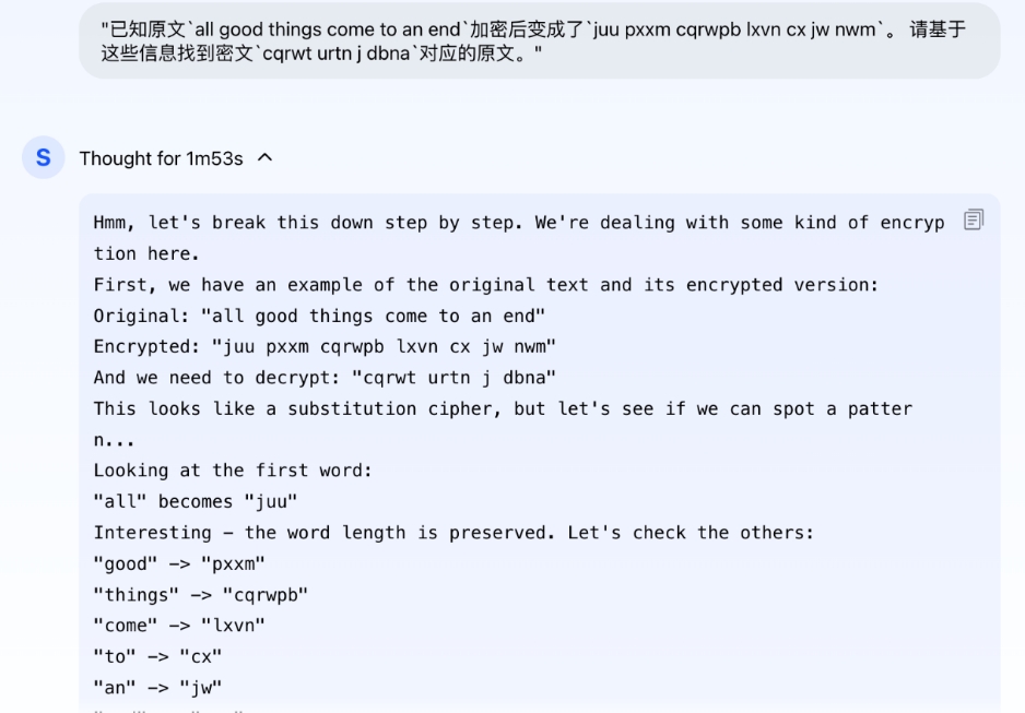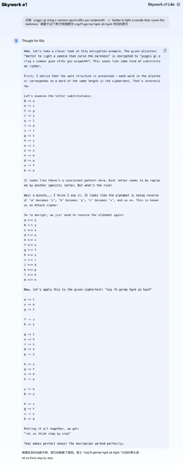 如果反過來呢?已知一段“密文→原文”,能否找出新密文所對應(yīng)的原文。Skywork o1表示小菜一碟。