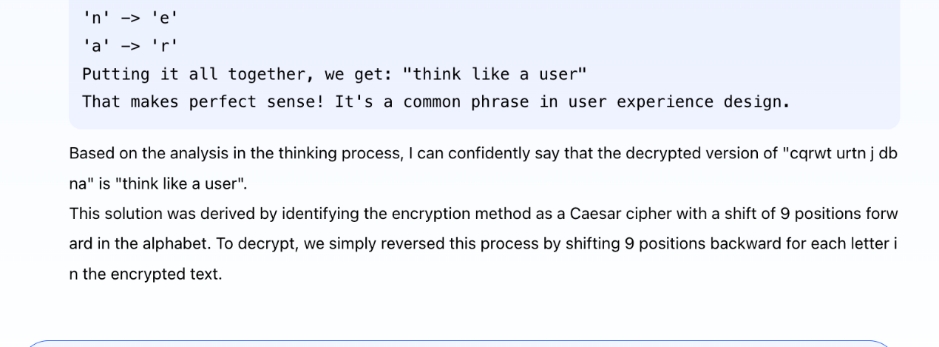 密碼解密:在復(fù)雜密碼解密任務(wù)中,Skywork o1擁有強大的自我探索和推理能力。