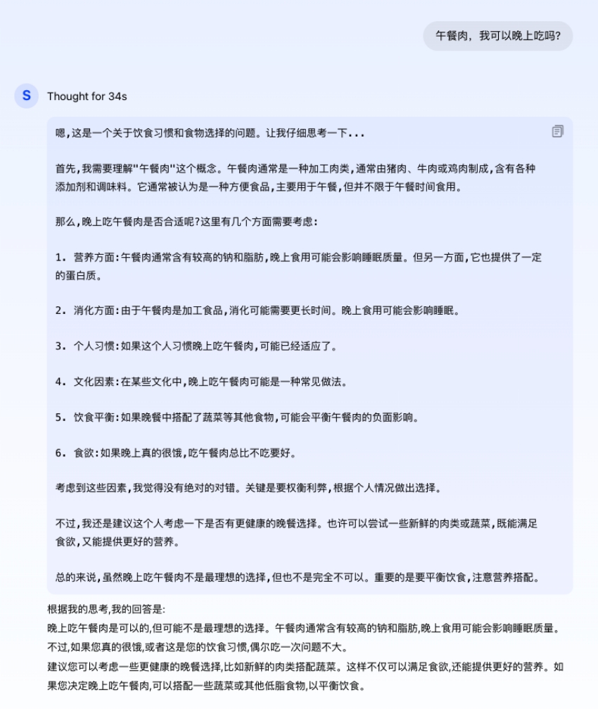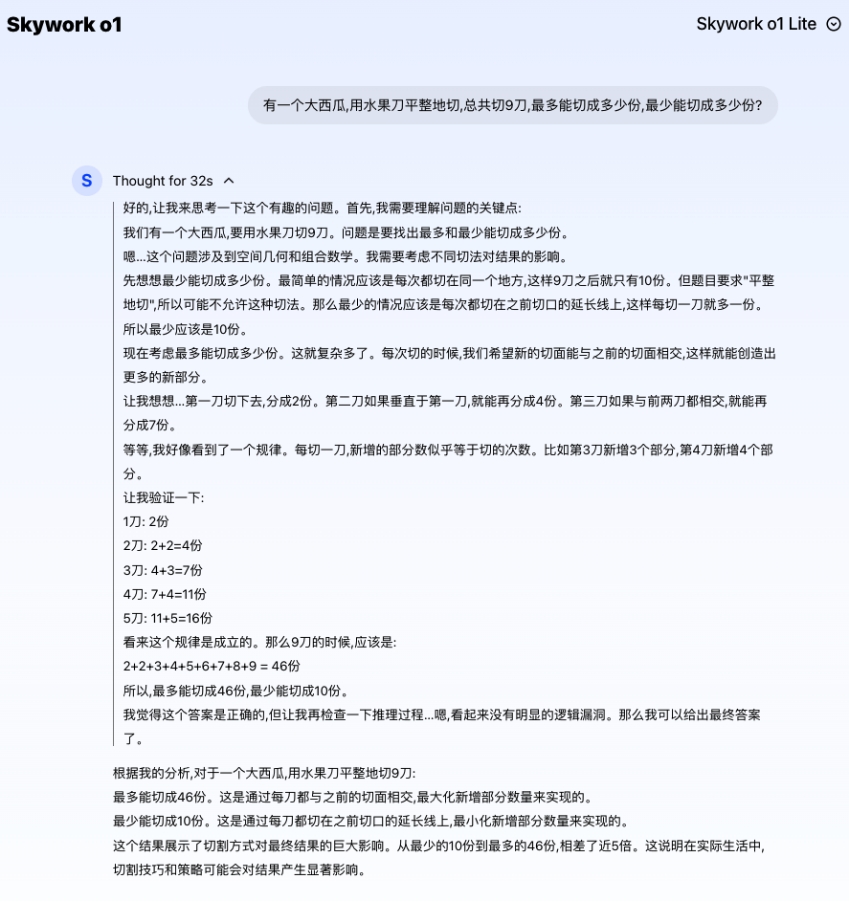 智力問答:在復(fù)雜的中文推理問題上,Skywork o1表現(xiàn)優(yōu)異,并給出了完整的思考鏈路。