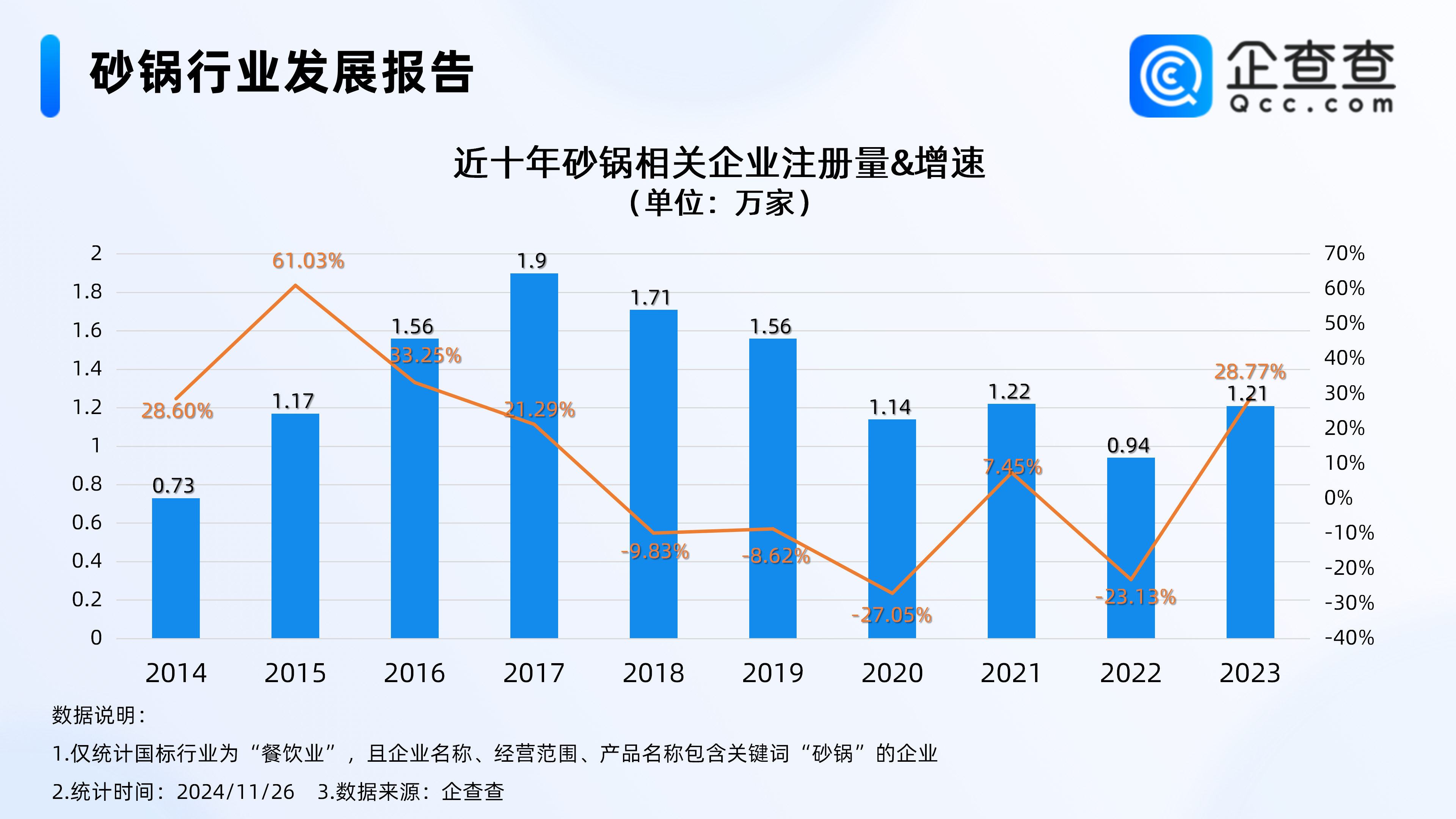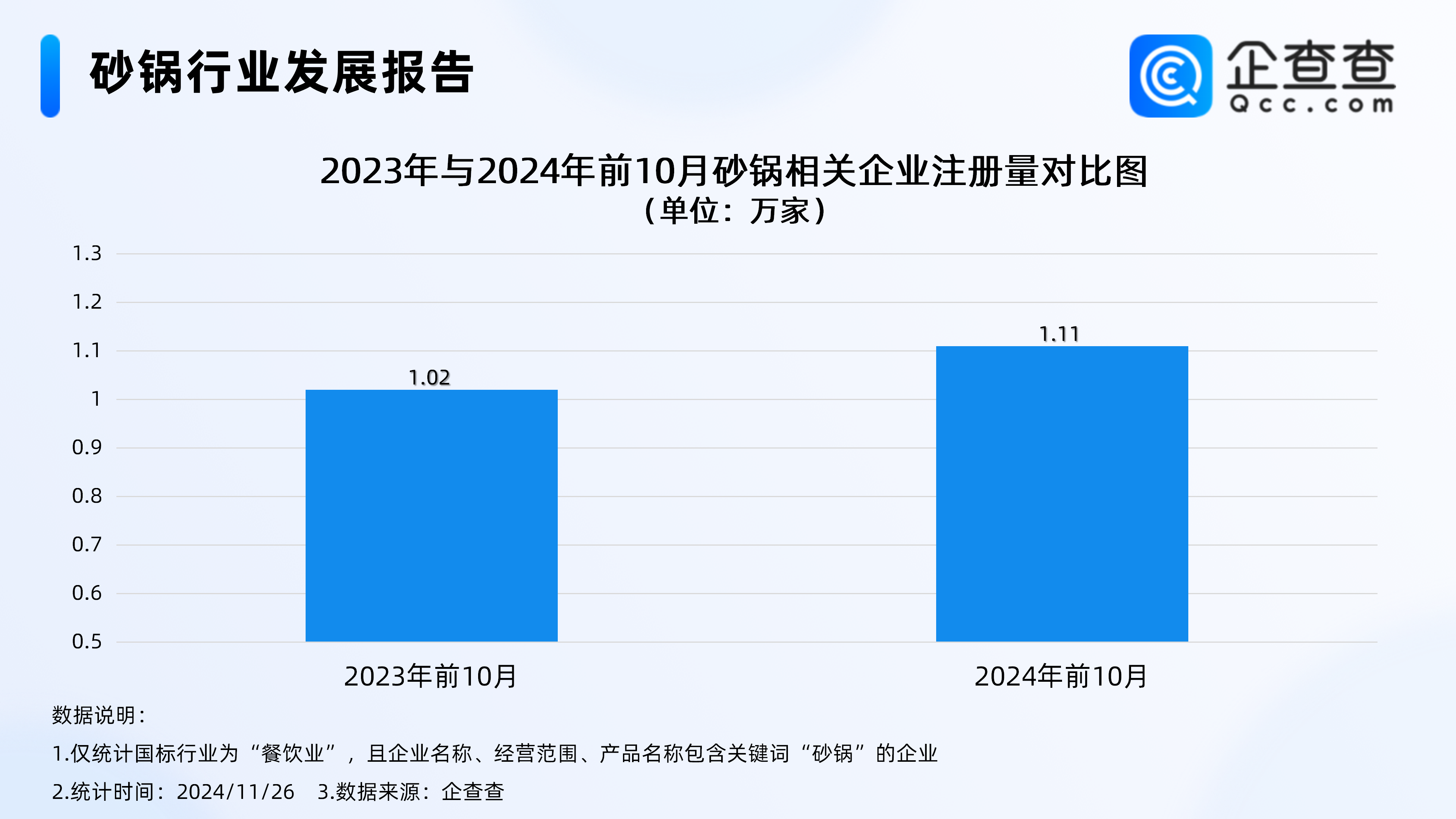 企查查數(shù)據(jù)顯示,截至目前,今年已注冊(cè)1.214萬家砂鍋相關(guān)企業(yè),已超去年全年注冊(cè)量,其中今年前10月注冊(cè)1.11萬家,同比增長近一成,為8.67%。