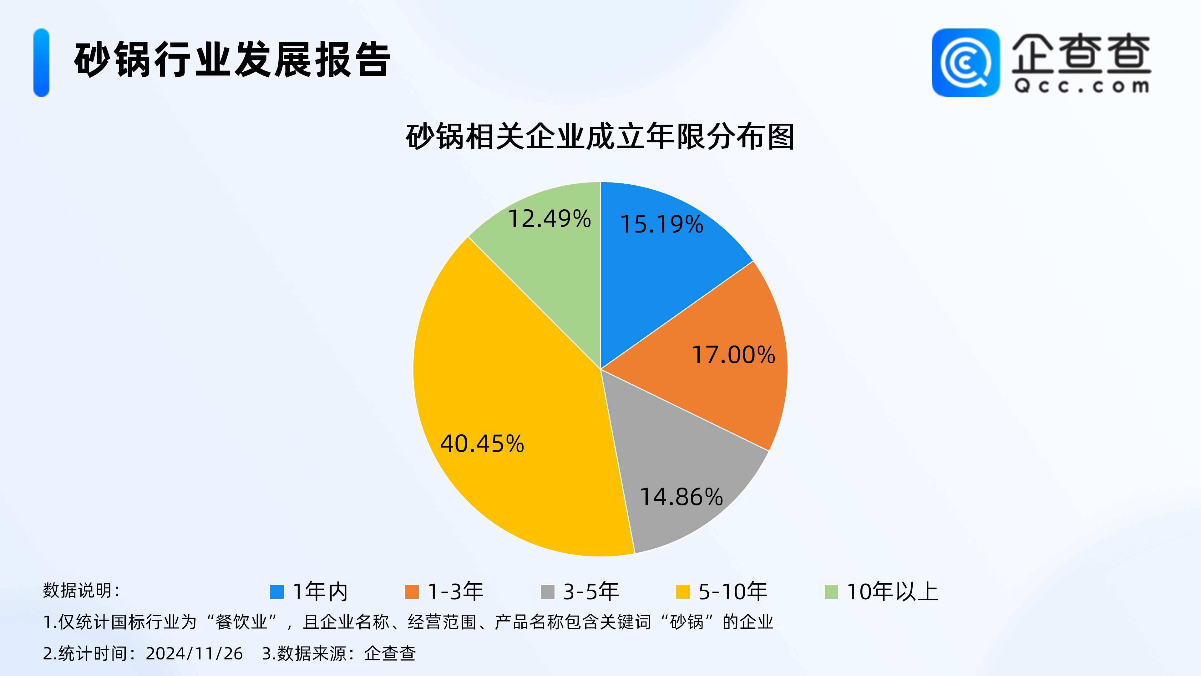 企查查數(shù)據(jù)顯示,現(xiàn)存砂鍋相關(guān)企業(yè)中,成立年限在5-10年的企業(yè)占比最大, 為40.45%。其次,成立年限在1年內(nèi)、1-3年、3-5年、10年以上的企業(yè)分別占比15.19%、17.00%、14.86%、12.49%。