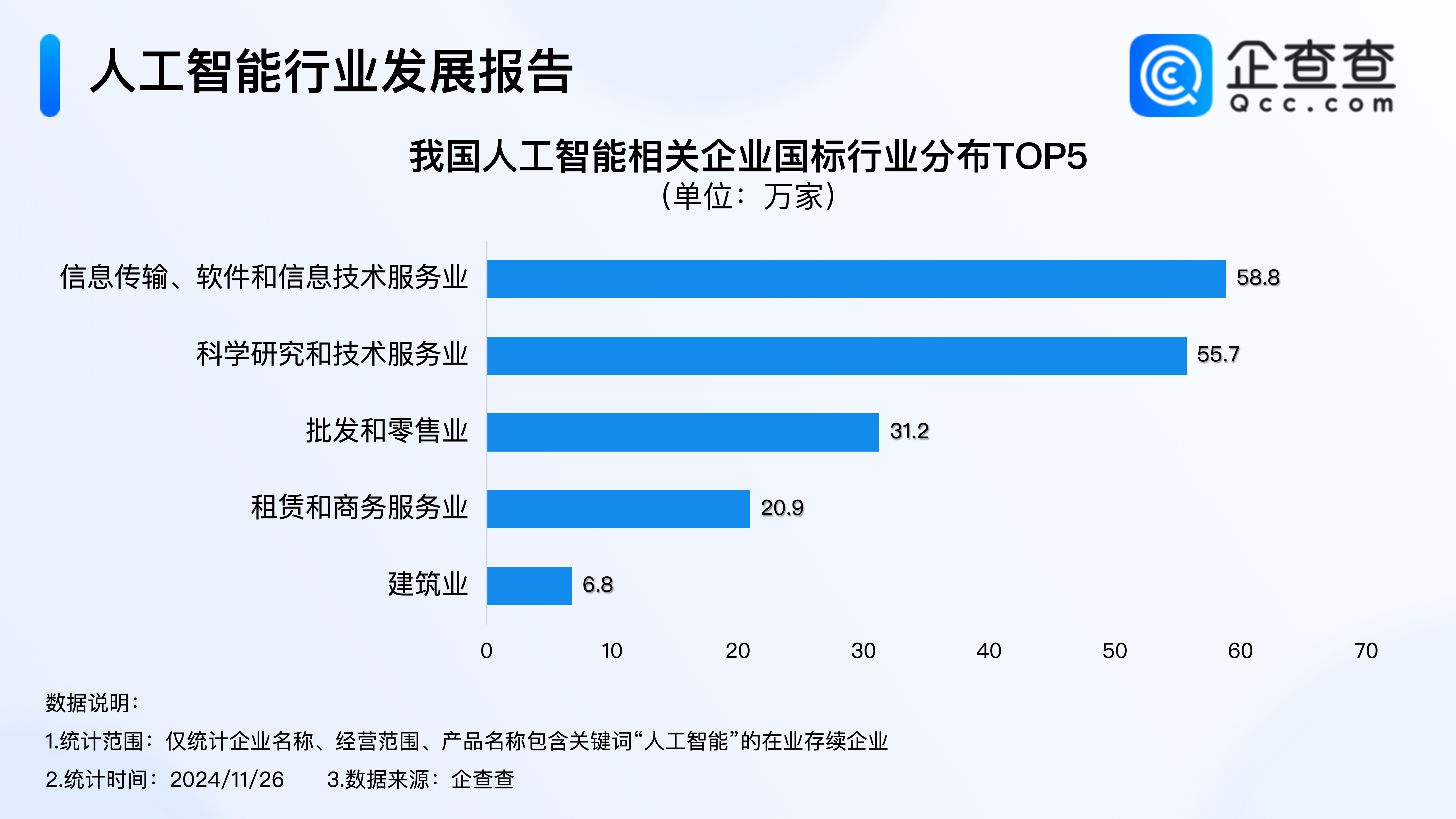 11 月 23 日,國家醫保局表示已將人工智能輔助診斷首次列入立項指南,在放射檢查、超聲檢查、康復類項目中設立 “人工智能輔助” 擴展項,且不額外增加患者負擔,這一舉措為 AI 輔助技術的臨床應用掃清了障礙。 2024年年初,“人工智能+”首次被寫入政府工作報告后,相關行動進展迅速。國家發改委強調其對新質生產力的推動作用,北京等多地出臺行動計劃,推動千行百業智能化轉型。“人工智能+工業”方面,東莞借其升級,AI “質檢員” 保障產品質量。“人工智能+交通運輸”方面,智能交通管理及自動駕駛技術不斷推進,有望改變出行、提升效率,另有金融、醫療、教育等,這些實例在多產業的積極作用,正有力推動新質生產力發展。 企查查數據顯示,近十年,我國人工智能相關企業注冊量逐年增加,并分別于2020年、2023年首次突破20萬家、50萬家。企業存量方面,我國現存193.1萬家人工智能相關企業,行業分布上,現代科技服務業合計占比59.3%。