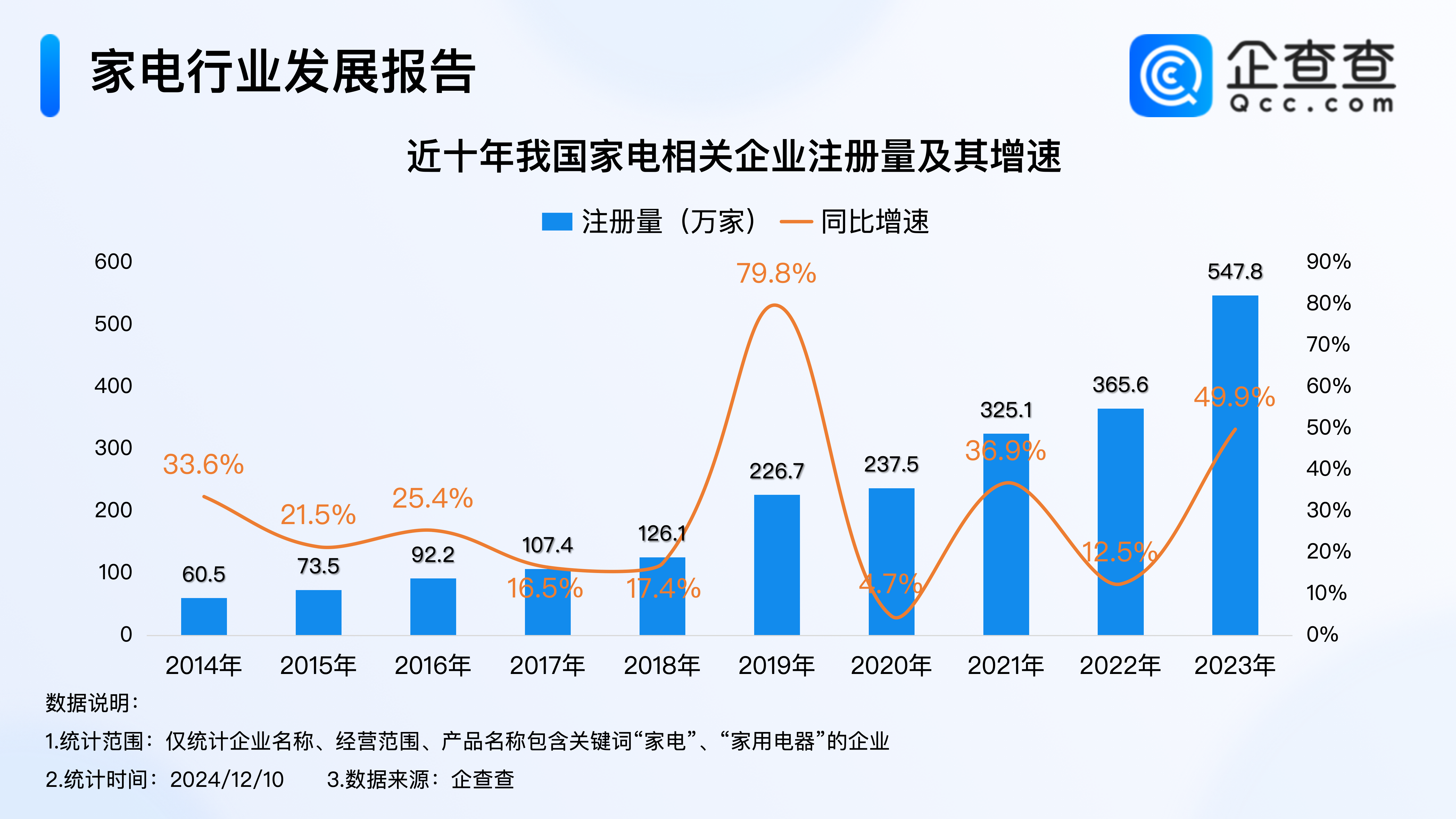 企查查數據顯示,近十年,我國家電相關企業注冊量逐年增加,其中2019年注冊量同比大幅增加79.8%至226.7萬家,達近十年注冊量增速峰值;2023年注冊量首次突破500萬家,全年注冊量同比增加49.9%至547.8萬家,創近十年注冊量新高。截至12月10日,2024年家電相關企業已注冊481.4萬家。