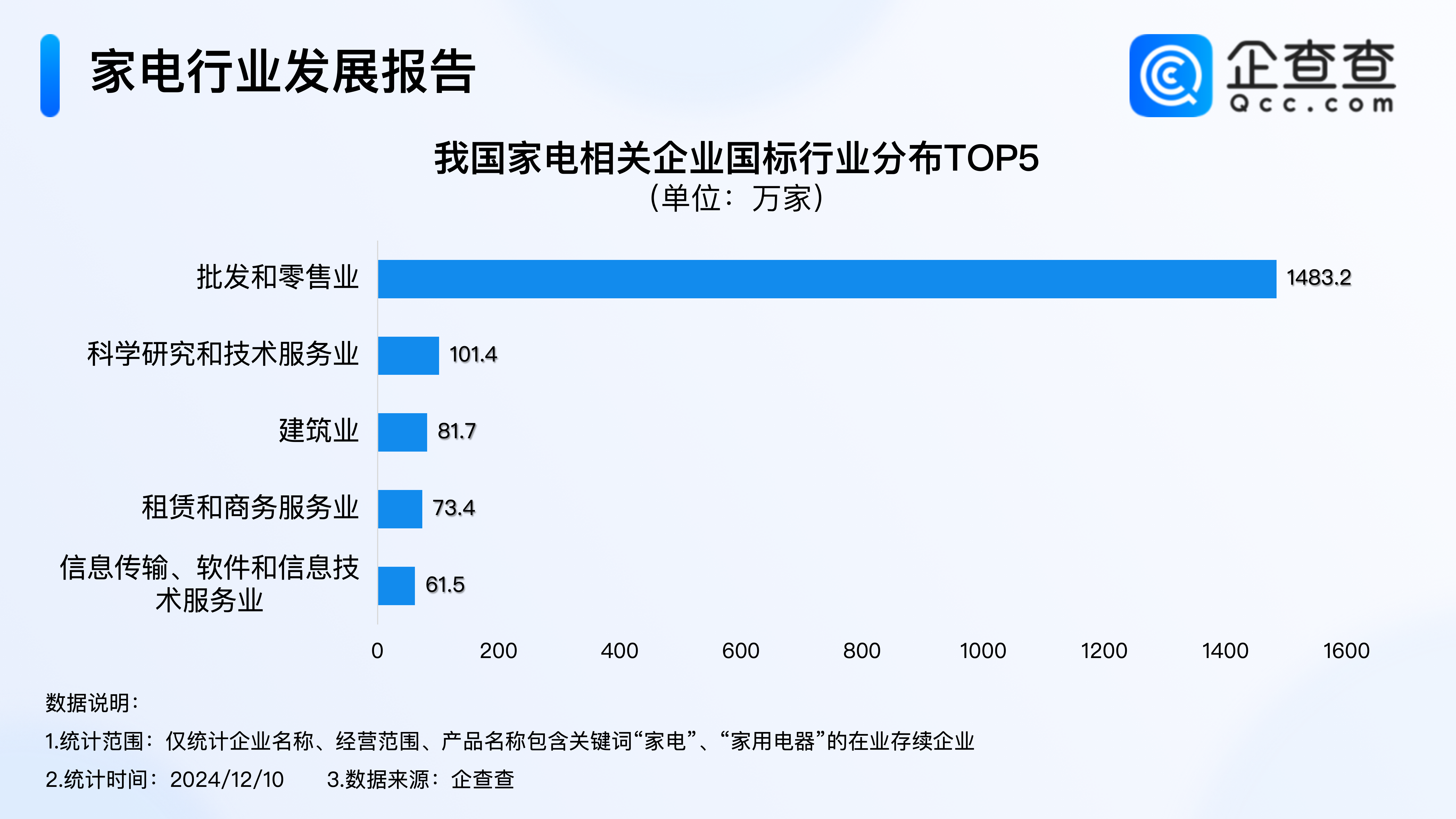 企查查數據顯示,行業分布上,我國家電相關企業高度集中批發和零售業,有1483.2萬家,占比75.4%;歸屬科學研究和技術服務業的企業有101.4萬家,占比5.2%。