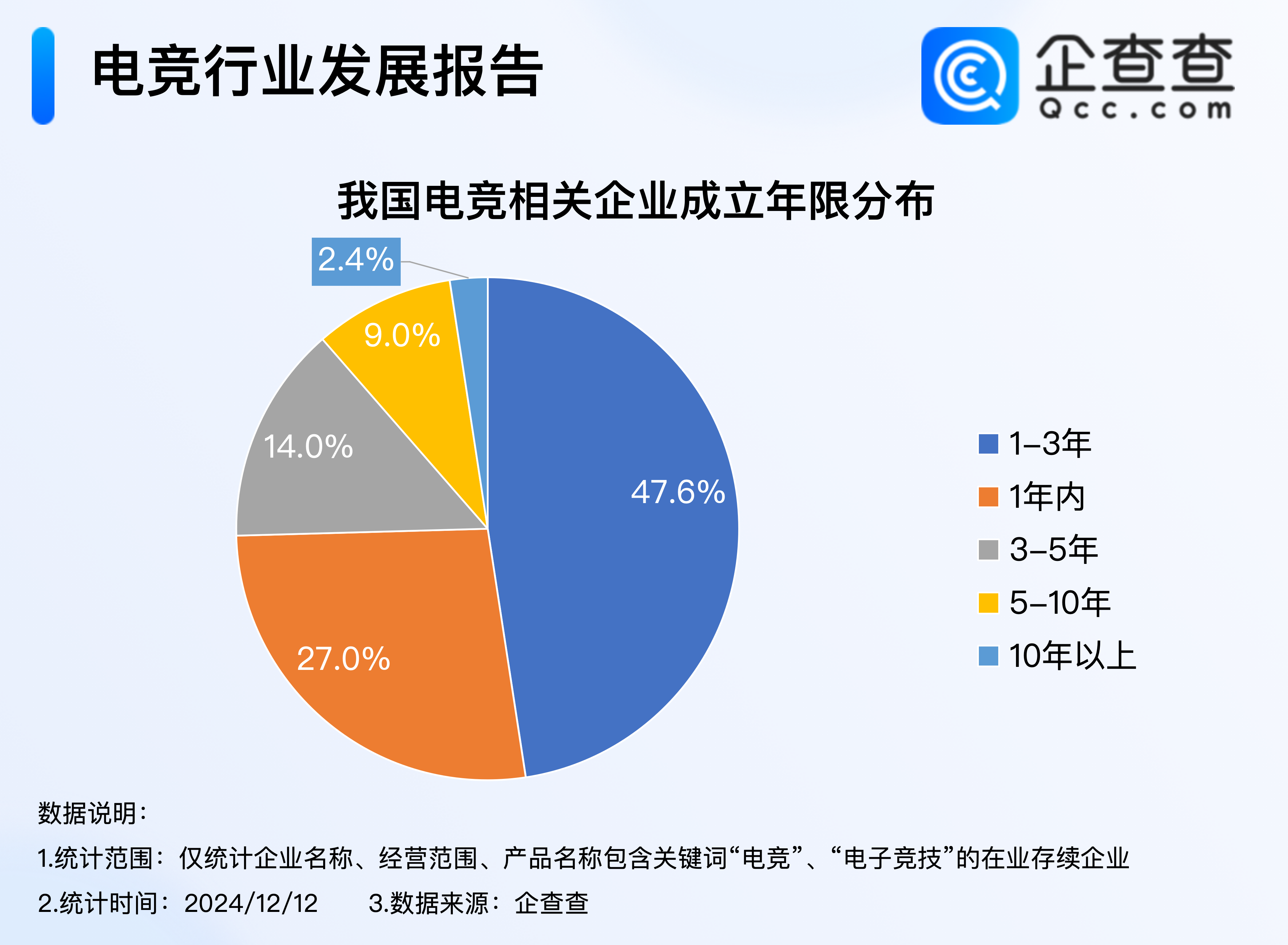企查查數(shù)據(jù)顯示,我國現(xiàn)存10.6萬家電競相關企業(yè)。成立年限上,我國電競行業(yè)發(fā)展處于新興階段,成立3年以內(nèi)的企業(yè)合計占比74.6%,其中成立年限在1年-3年的企業(yè)數(shù)量最多,占總量的比重達47.6%。
