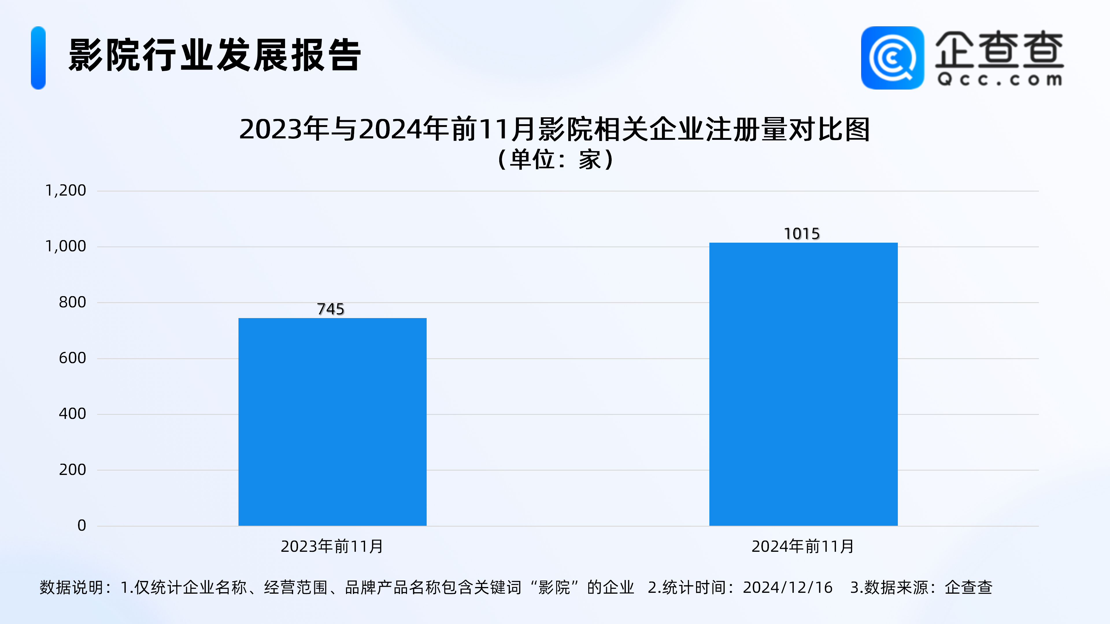 企查查數據顯示,截至目前,今年累計注冊1070家影院相關企業,已超去年全年注冊量。其中前11月累計注冊1015家,較去年同期增長36.24%。