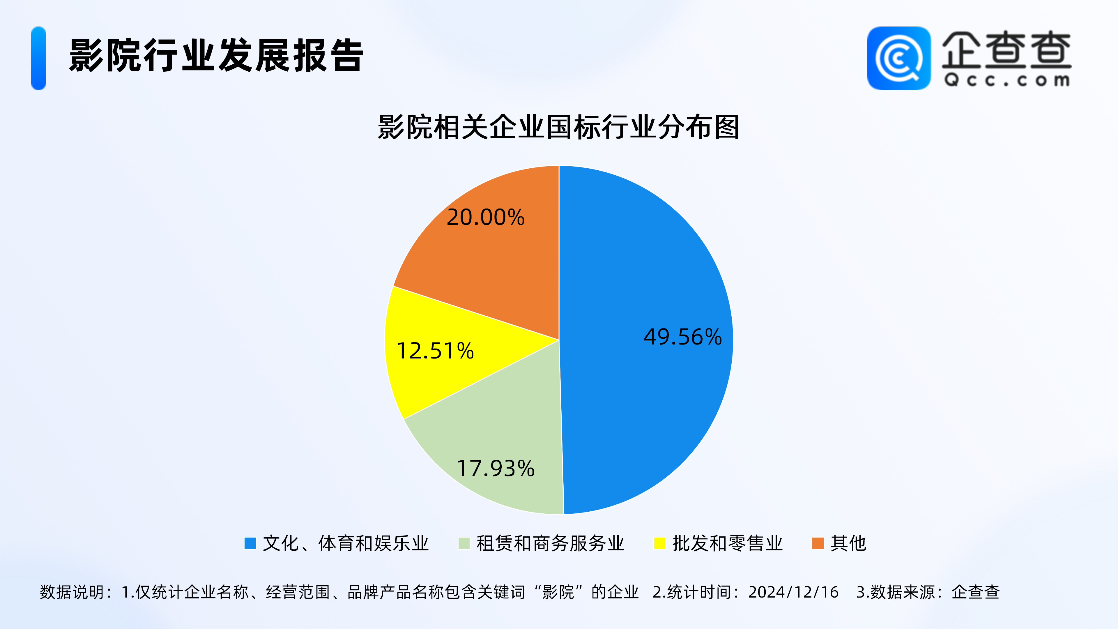 企查查數據顯示,從國標行業的分布來看,現存影院相關企業中,歸屬于文化、體育和娛樂業的相關企業達49.56%。其次,歸屬于租賃和商務服務業、批發和零售業的企業分別占比17.93%、12.51%。