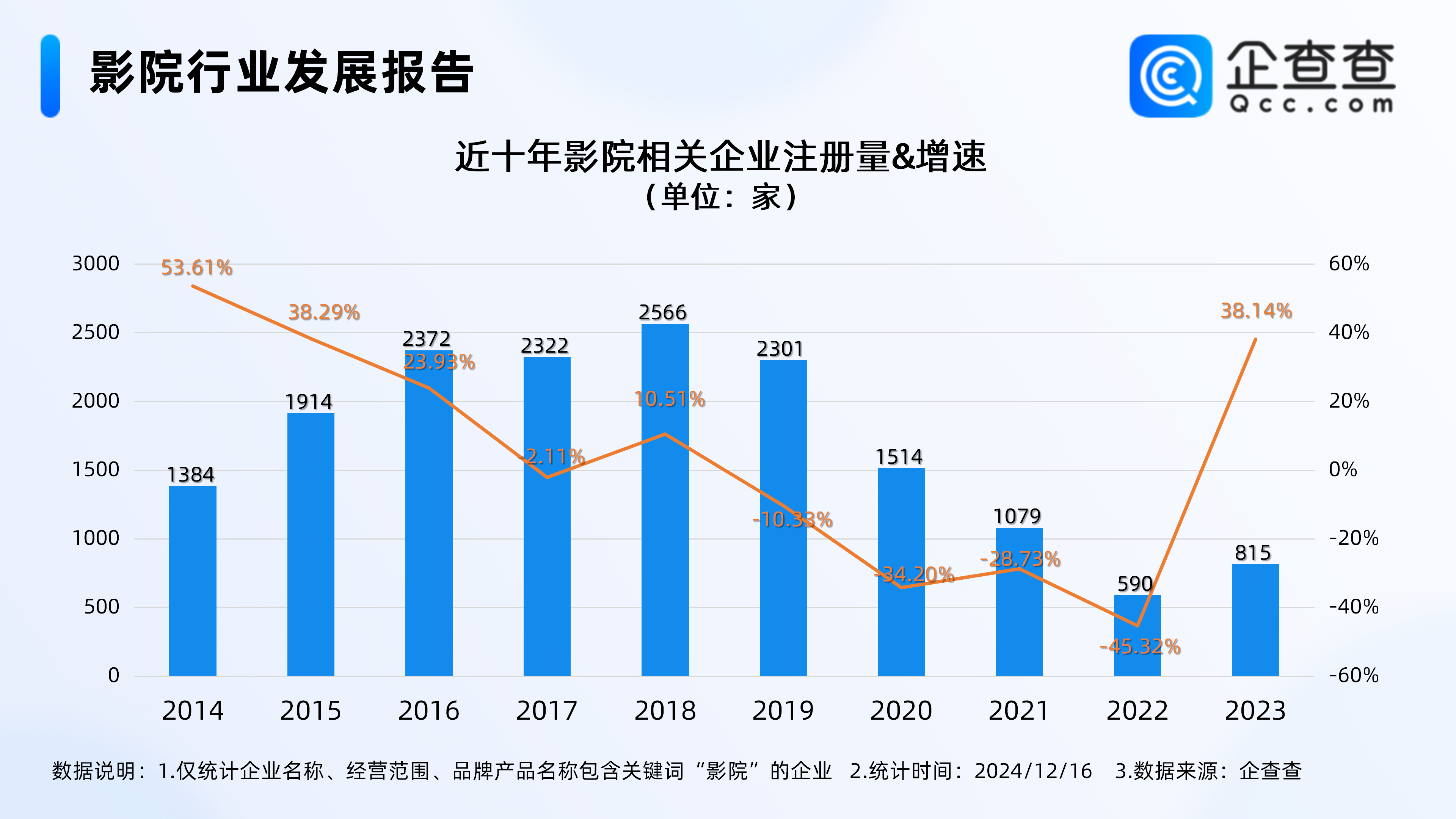 企查查數據顯示,國內現存影院相關企業1.53萬家。近十年相關企業注冊量上下波動,其中2018年全年注冊2566家,為近十年注冊量峰值。2023年影院需求回溫,全年注冊815家相關企業,同比增長38.14%。