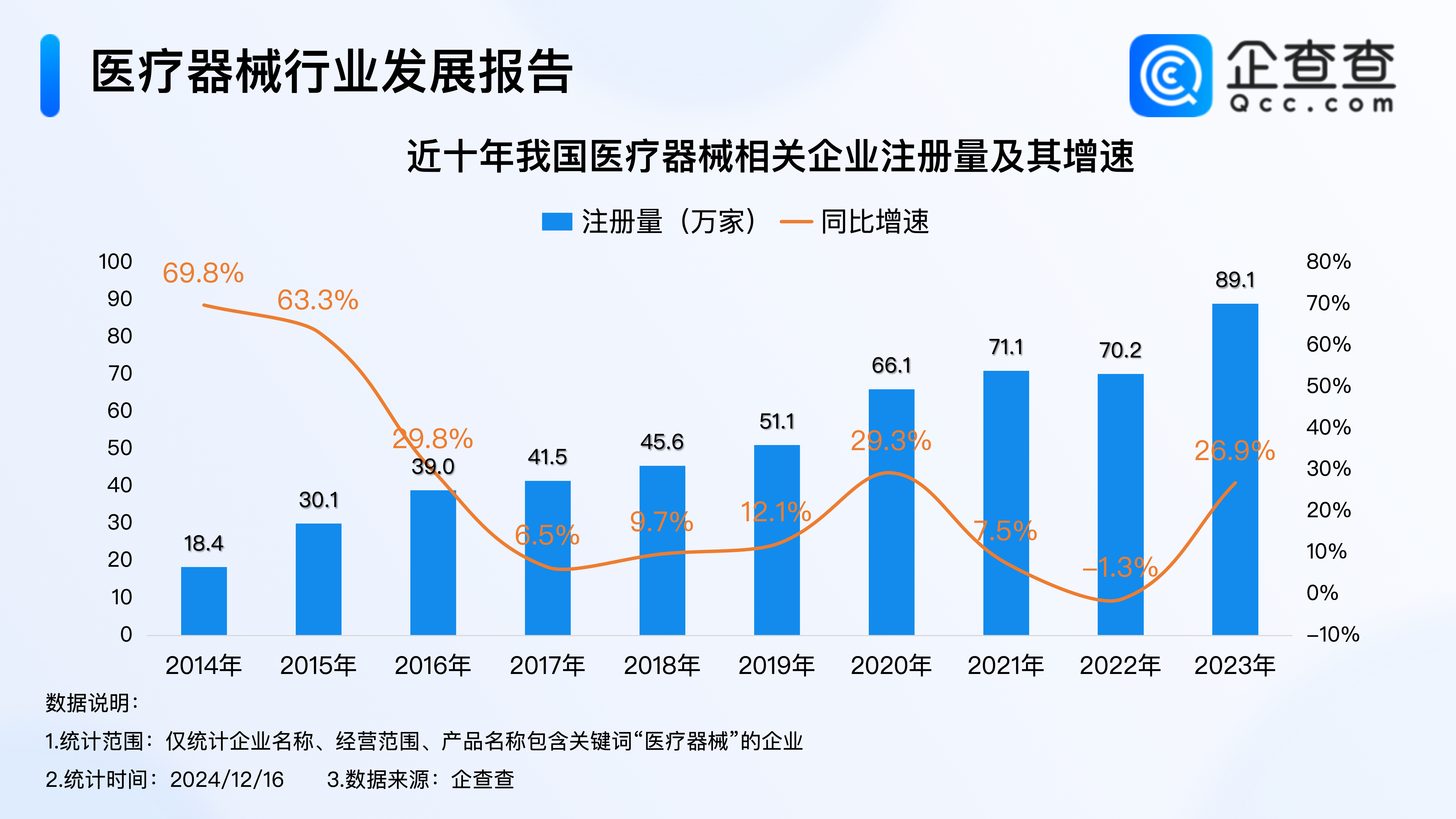 企查查數據顯示,近十年,我國醫療器械相關企業注冊量基本呈現逐年增加的趨勢,并于2019年首次突破50萬家。2023年共注冊89.1萬家醫療器械相關企業,創近十年注冊量新高。截至12月16日,2024年我國已注冊80.6萬家醫療器械相關企業。