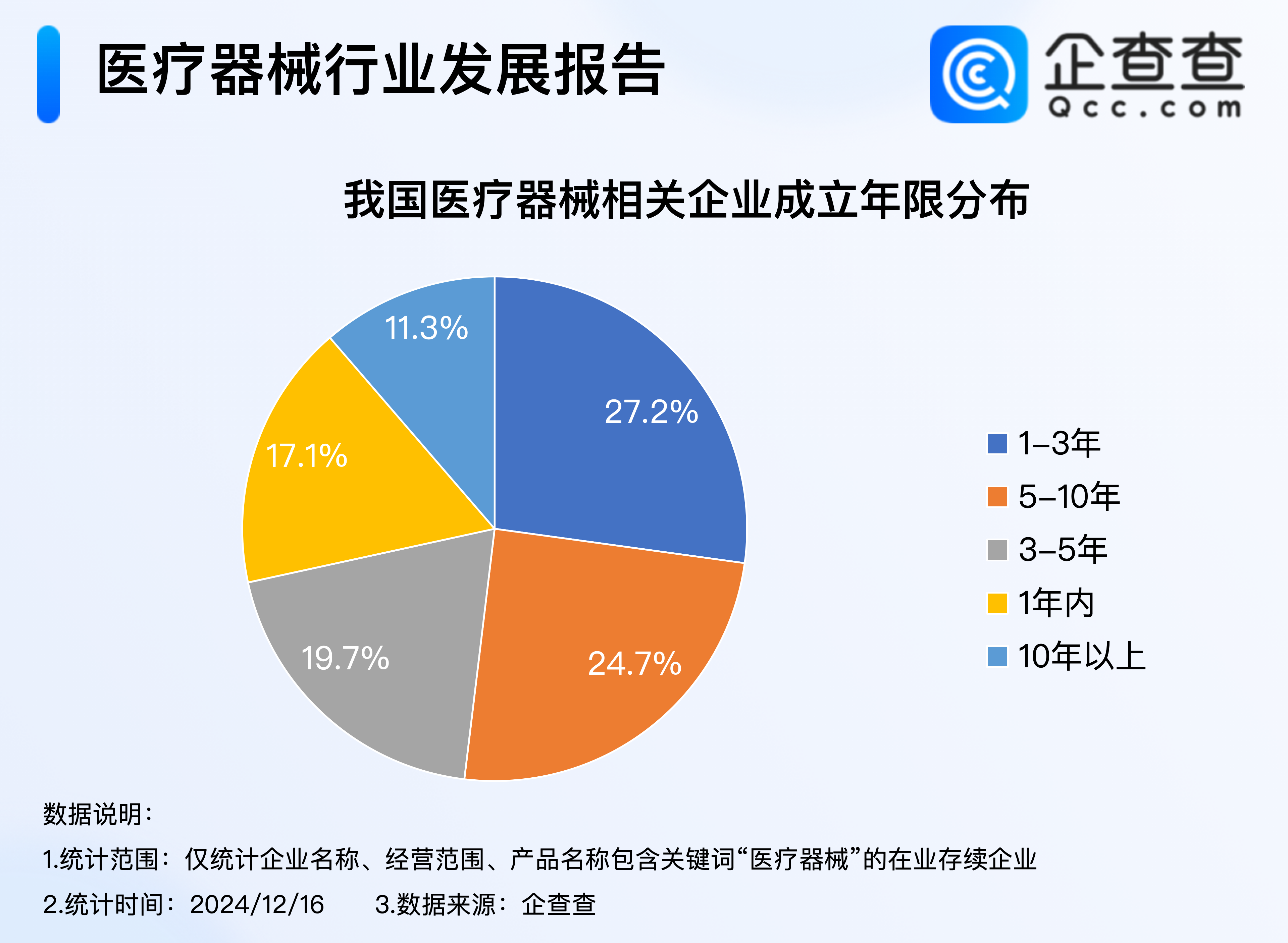 企查查數據顯示,我國現存470.9萬家醫療器械相關企業。成立年限上分布相對均衡,其中成立年限在3年內的企業占比44.3%,成立年限在3年至10年之間的企業占比44.4%。