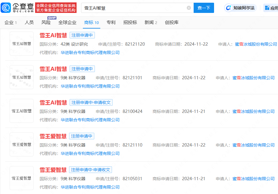 企查查APP顯示,近日,蜜雪冰城股份有限公司申請注冊多枚“雪王AI智慧”、“雪王愛智慧”商標,國際分類包括科學儀器、設計研究,目前商標狀態均為注冊申請中。 據悉,今年11月,蜜雪冰城旗下鄭州寶島科技有限公司、河南雪王科技有限公司成立了雪王愛智慧科技(鄭州)有限公司,后者經營范圍包含人工智能公共數據平臺、人工智能基礎軟件開發、智能機器人銷售等。