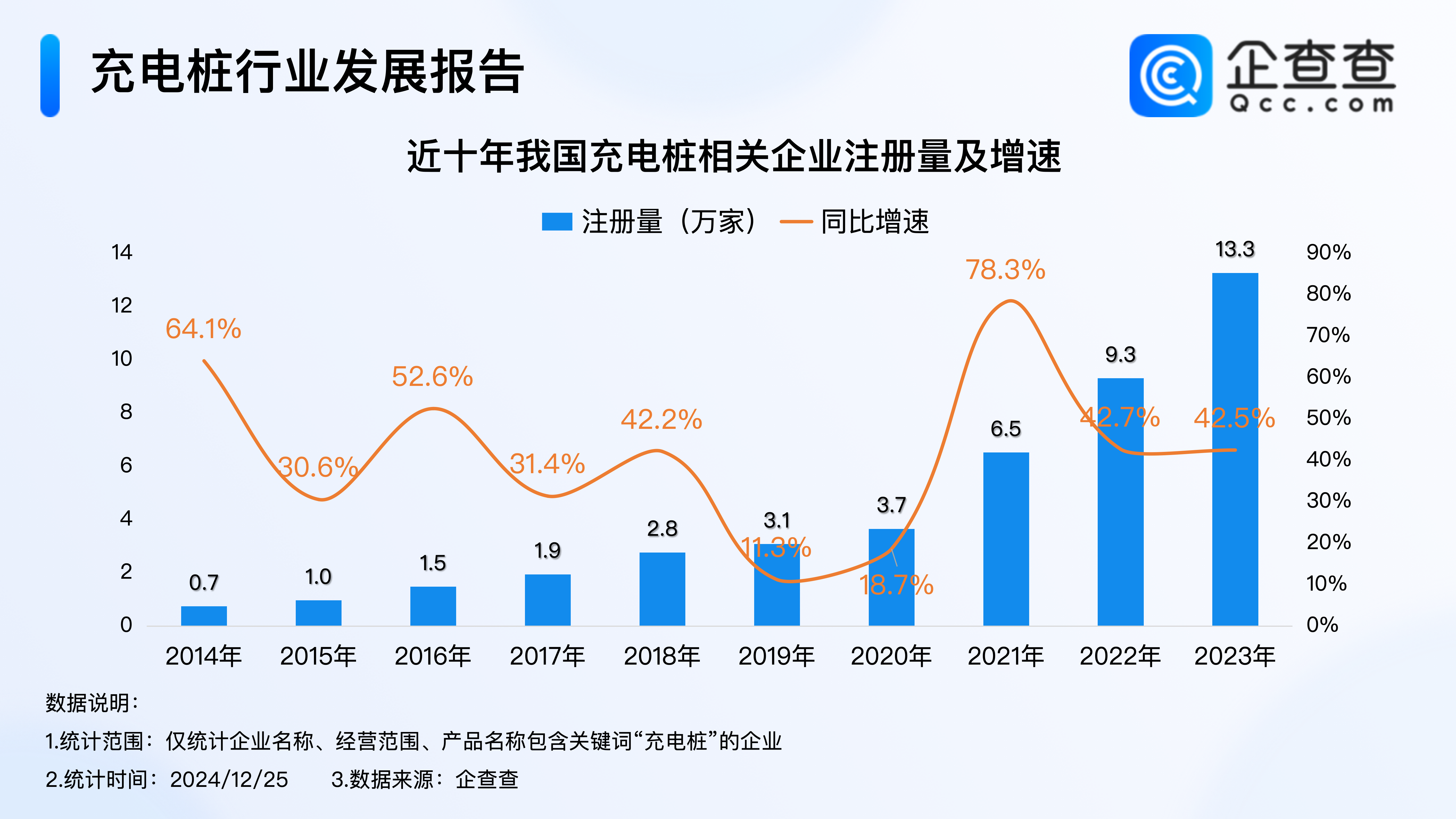企查查數(shù)據(jù)顯示,近十年,我國充電樁相關(guān)企業(yè)注冊量逐年增加,且2021年開始增速加快。2021年我國充電樁相關(guān)企業(yè)注冊量同比大幅增加78.3%至6.5萬家,達近十年注冊量增速高峰,2023年,我國充電樁相關(guān)企業(yè)注冊量首次突破10萬家,全年注冊量同比增加42.5%至13.3萬家,創(chuàng)近十年注冊量新高。截至12月25日,2024年我國已注冊14.42萬家充電樁相關(guān)企業(yè),已超2023年全年。