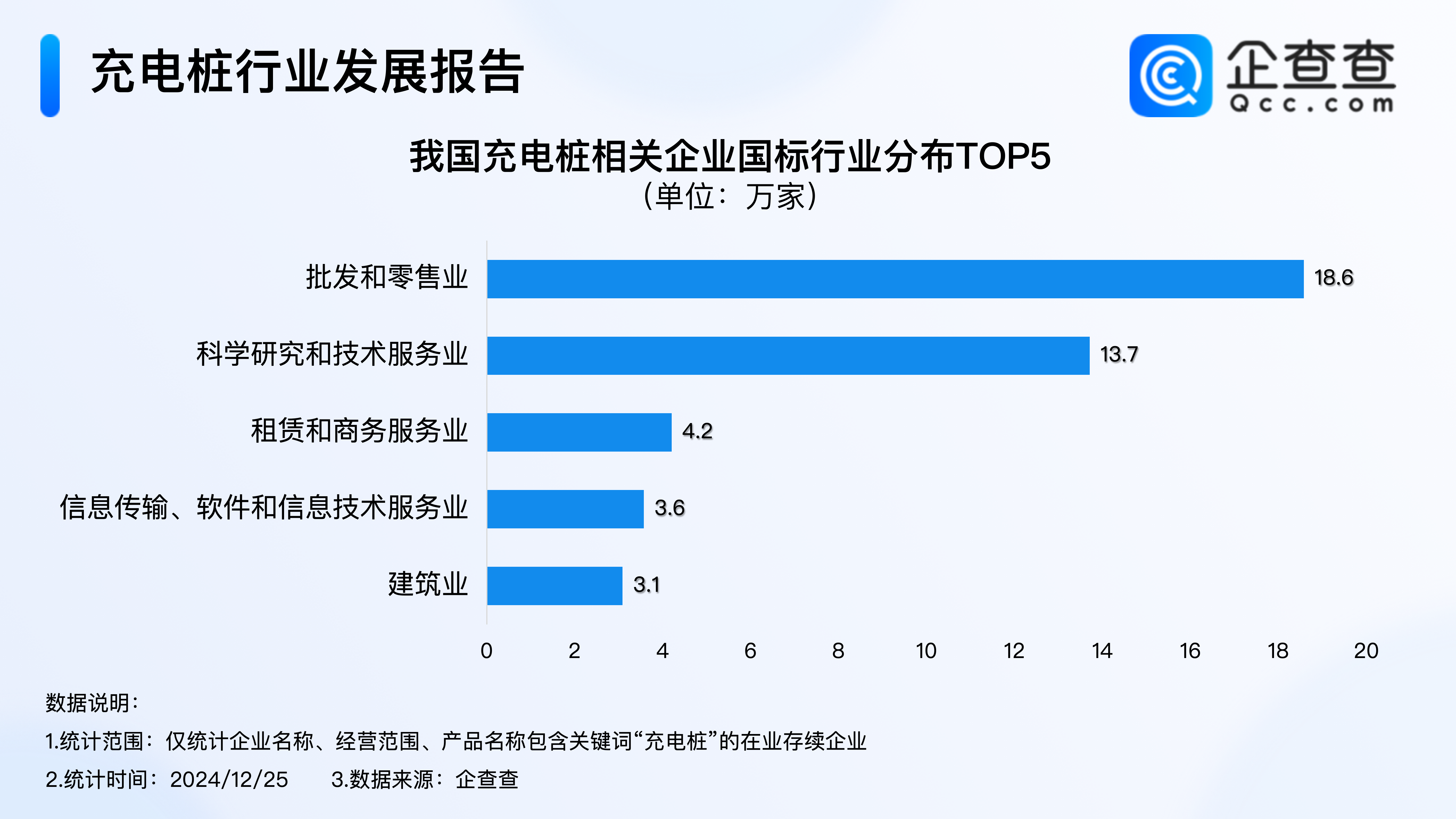 企查查數(shù)據(jù)顯示,我國現(xiàn)存52.8萬家充電樁相關(guān)企業(yè)。行業(yè)分布上,目前我國現(xiàn)存的充電樁相關(guān)企業(yè)中,歸屬批發(fā)和零售業(yè)的企業(yè)最多,有18.6萬家,占比35.2%,其次是歸屬科學(xué)研究和技術(shù)服務(wù)業(yè)的企業(yè),有13.7萬家,占比26.0%;歸屬租賃和商務(wù)服務(wù)業(yè)的企業(yè)有4.2萬家,占比8.0%。