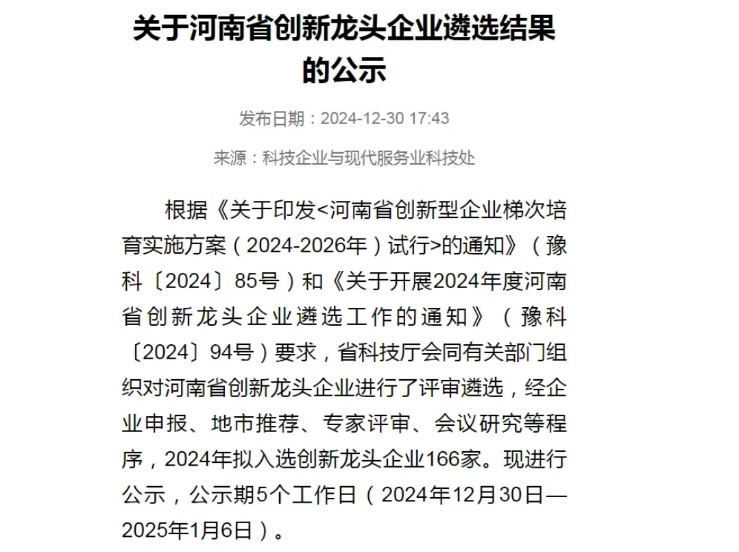 河南省創(chuàng)新龍頭企業(yè)獎項旨在認定并激勵在創(chuàng)新領(lǐng)域表現(xiàn)卓越、對產(chǎn)業(yè)發(fā)展起龍頭引領(lǐng)作用的企業(yè)。評選聚焦企業(yè)的高新技術(shù)資質(zhì)、知識產(chǎn)權(quán)數(shù)量、行業(yè)引領(lǐng)地位、規(guī)模與研發(fā)投入強度、人才隊伍及研發(fā)平臺建設(shè)等多方面,嚴格篩選出符合標準的企業(yè)。通過企業(yè)自評申報、地方初審?fù)扑]、省級復(fù)核遴選及公示入庫等流程確定入選名單。