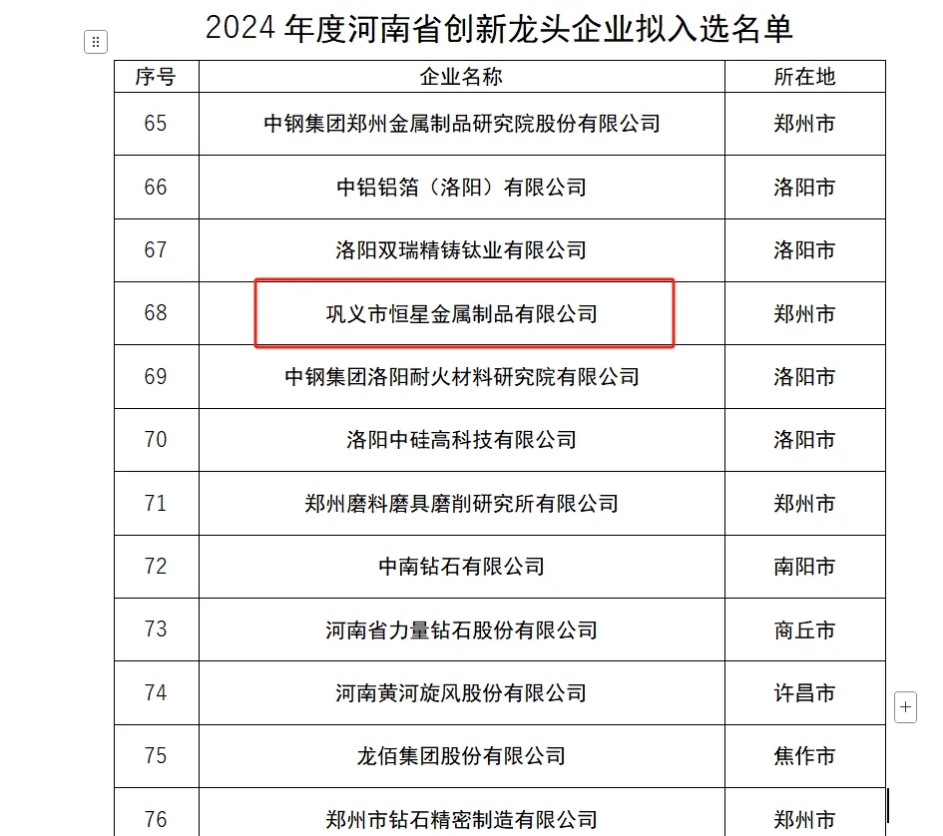 12月30日,河南省科學(xué)技術(shù)廳發(fā)布關(guān)于河南省創(chuàng)新龍頭企業(yè)遴選結(jié)果的公示。其中,鞏義市恒星金屬制品有限公司(以下簡稱“恒星金屬”或“公司”)入選河南省創(chuàng)新龍頭企業(yè)擬定名單。