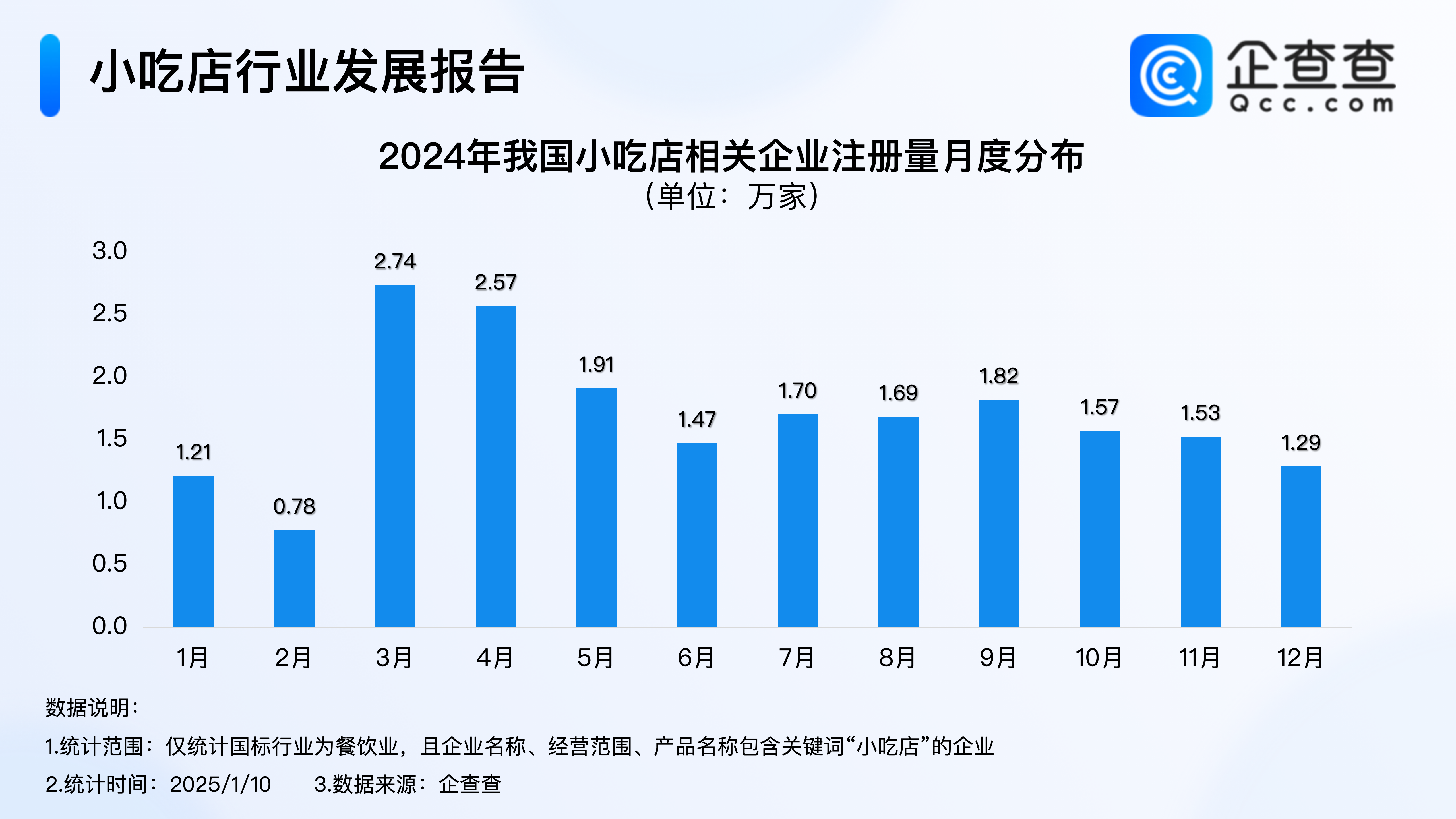 根據企查查數據,2024年我國累計注冊20.3萬家小吃店相關企業,其中3月、4月分別注冊2.74萬家、2.57萬家,成為2024年小吃店相關企業注冊高峰月份,5月至12月注冊量基本保持在1.5萬家至1.9萬家之間。