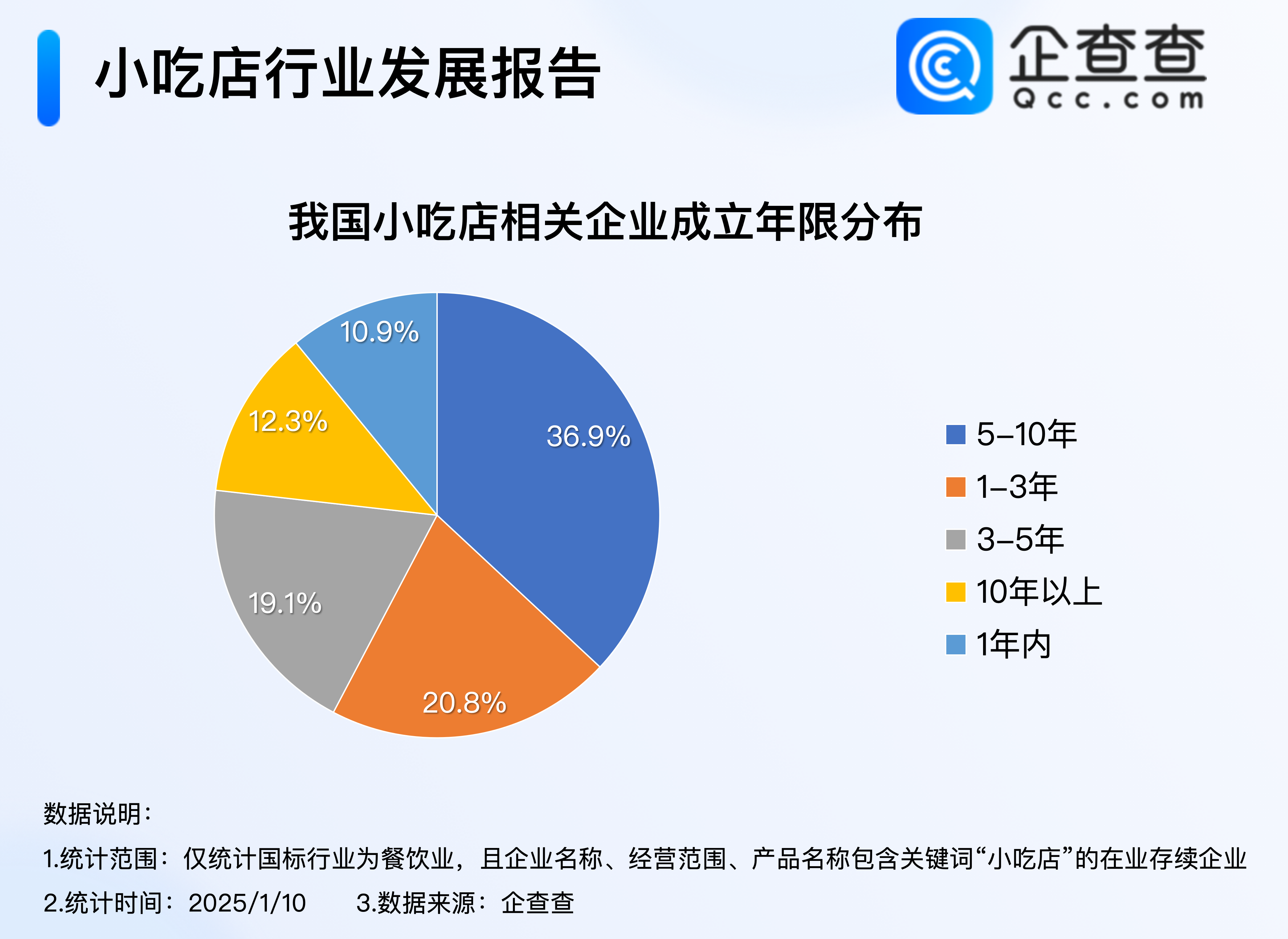 企查查數據顯示,我國現存161.6萬家小吃店相關企業。成立年限上,我國小吃店相關企業成立于5-10年之間的最多,占比36.9%,其次是成立1年-3年的企業,占比20.8%,成立1年以內的小吃店相關企業最少,占比10.9%。