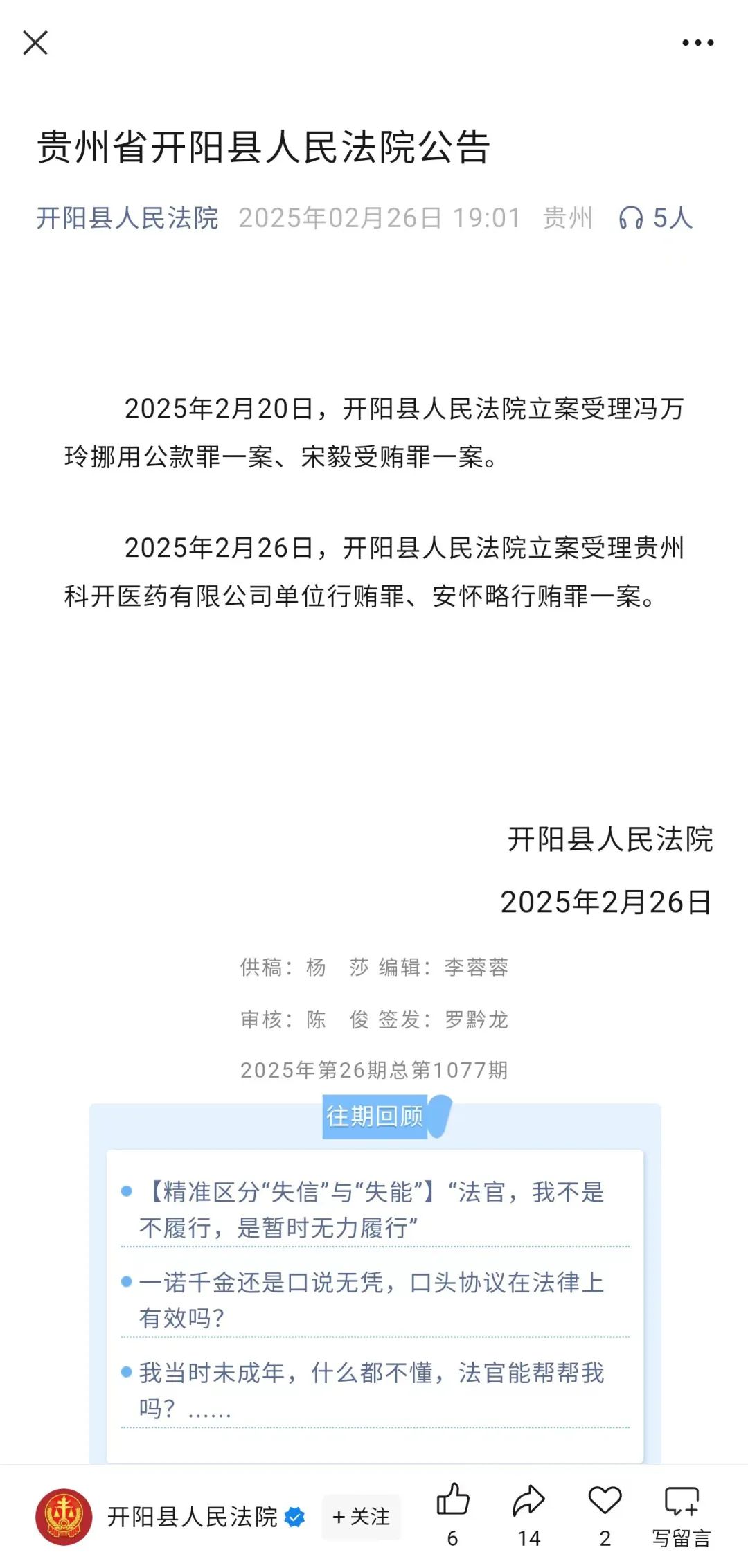 日前,貴州省開陽縣人民法院在其微信公眾號發布了一則公告,稱2025年2月26日,該院立案受理貴州科開醫藥有限公司(以下簡稱“科開醫藥”)單位行賄罪、安懷略行賄罪一案。