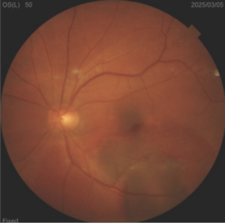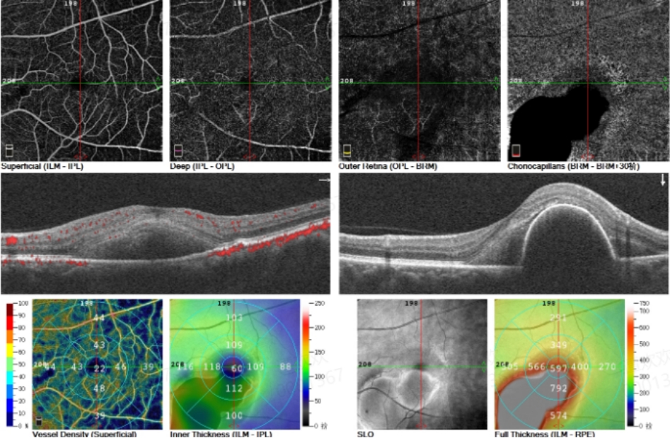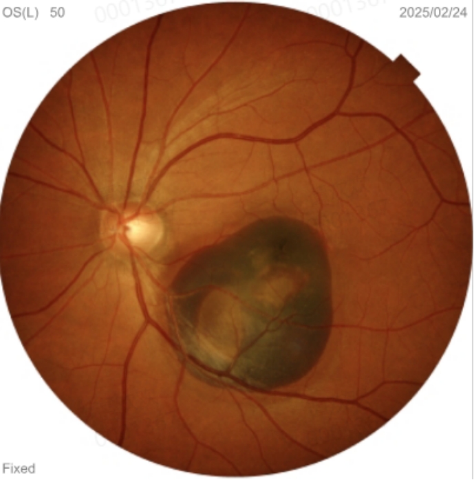 來自郴州的胡先生(化名),今年59歲,他告訴醫生4天前自己在開車時,突然間眼睛中央就被紅色的血塊遮住了,以為觀察兩天會好起來,結果越來越看不清了。于是來到長沙愛爾,經眼底科譚歡歡副主任醫生詳細檢查,確診為"左眼AMD(PCV型)"。患者入院時視力0.2。