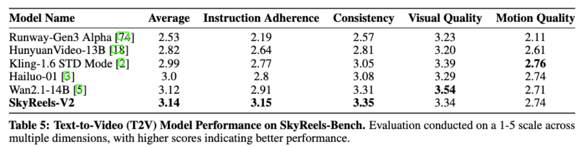 圖丨在SkyReels-Bench的T2V多維度人工評測集下,SkyReels-V2在指令遵循和一致性得到最高水準,同時在視頻質量和運動質量上保持第一梯隊