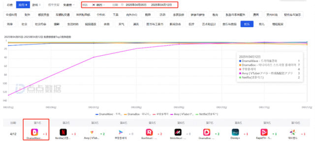 截至2025年3月,DramaWave月活躍用戶量已突破1000萬大關,用戶規模成功躋身行業前五,穩居出海短劇賽道第一梯隊。平臺旗下爆款短劇《訂婚風暴》表現強勁,上線僅5天播放量便突破千萬大關。在該劇的推動下,DramaWave自4月5日起成功躋身韓國Google Play娛樂應用榜TOP 10,并持續逼近長期占據領先地位的Netflix。隨后,其市場表現進一步攀升,于4月12日登頂該榜單榜首,并連續霸榜四天,實現在韓國市場對Netflix的超越。