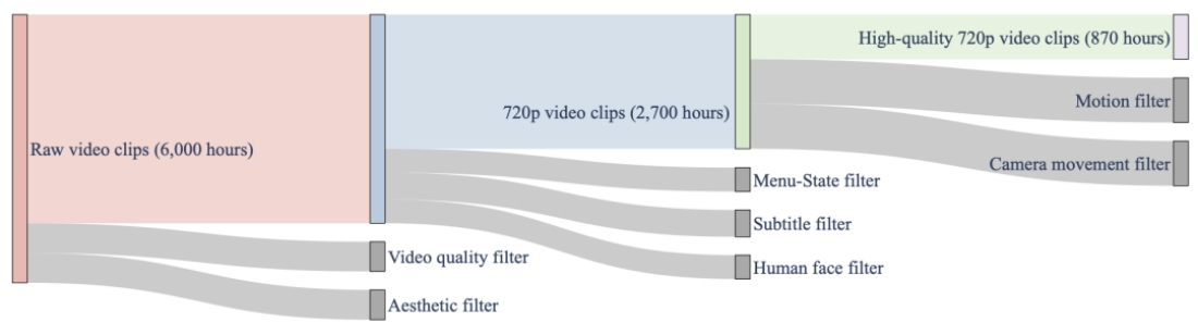 · 無標簽預訓練數據集采用三階段過濾機制從6000小時的MineDojo數據中過濾出近千小時高質量數據: (1) 畫質與美學過濾;(2) 非游戲內容剔除;(3) 動態與視角穩定性過濾。
