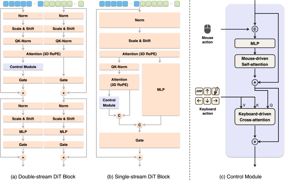 § 交互可控生成:融合用戶動作輸入(如鍵盤、鼠標等),通過類似Flux與HunyuanVideo的多模態擴散模型直接生成虛擬游戲世界的視頻內容。