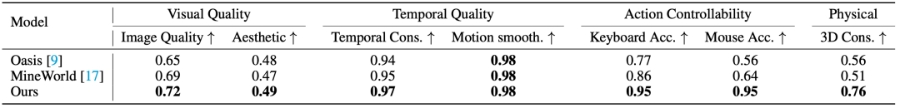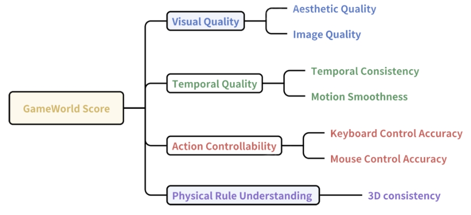 3. GameWorld Score評測體系:提出統一的游戲交互世界評估標準,從視頻的視覺質量、時序質量、動作可控性與物理規則理解四個維度,全面量化模型性能,填補了該領域缺乏系統性評測基準的空白。