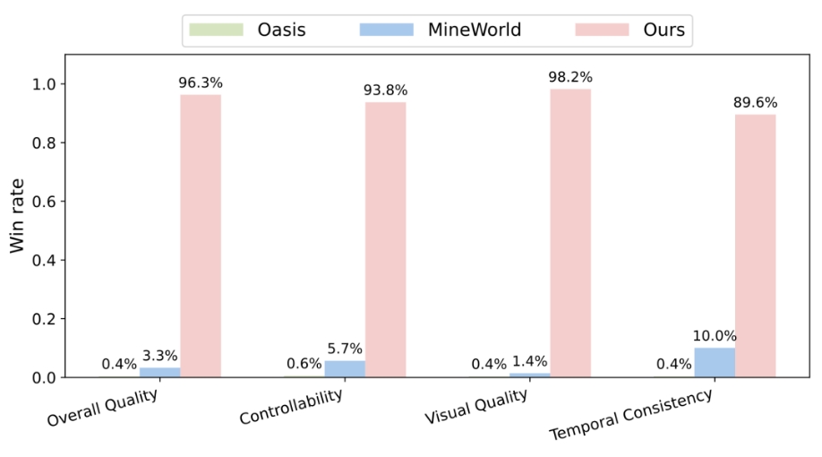 在雙盲人評實驗中,用戶更傾向于選擇 Matrix-Game生成的視頻: