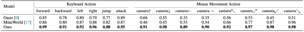 在控制性能上,Matrix-Game可實現:“運動”“攻擊”等動作高達 90%+ 準確率;細粒度視角控制下依然保持高精度響應。