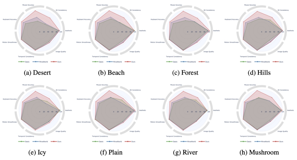 在GameWorld Score評測系統中,Matrix-Game在視覺質量、時間一致性、動作可控性與物理規則理解四大維度上均取得領先成績,全面超越現有開源基線模型 Oasis 與 MineWorld。