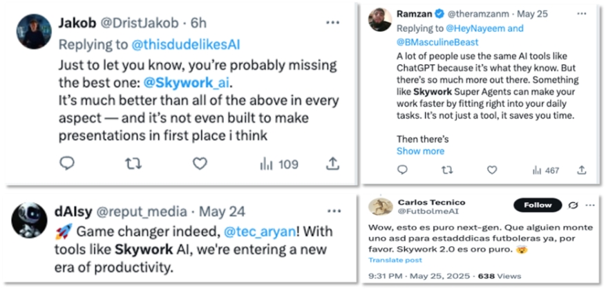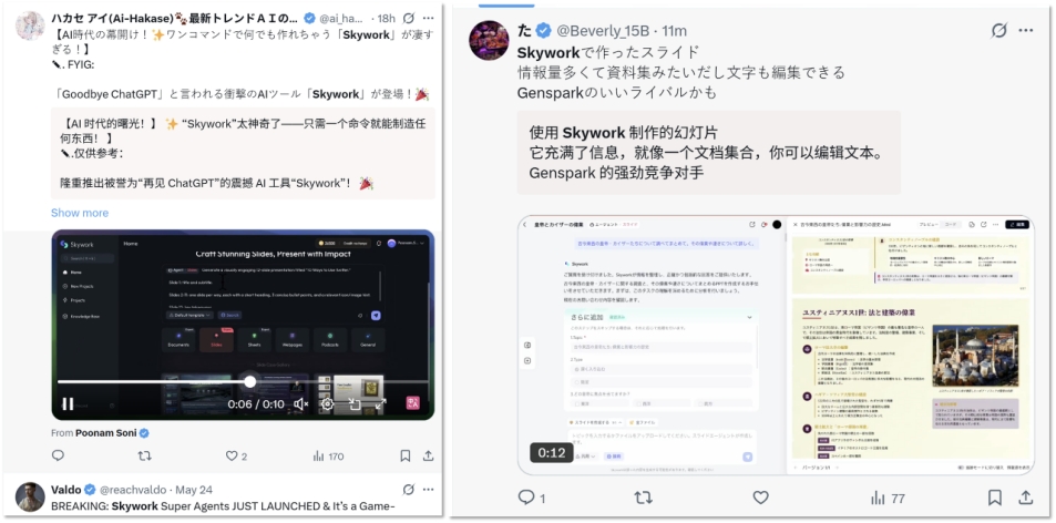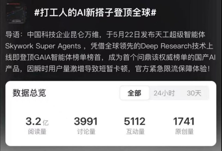作為采用了AI agent架構(gòu)和Deep Research技術(shù),能夠一站式生成文檔、PPT、表格(Excel)、網(wǎng)頁、播客和音視頻多模態(tài)內(nèi)容的新一代智能體,一經(jīng)正式發(fā)布,昆侖萬維天工超級智能體相關(guān)話題在微博平臺總閱讀量超過3.5億,在X、Google、Linkedin、Youtube等平臺上兩天內(nèi)閱讀量超過2000萬次。