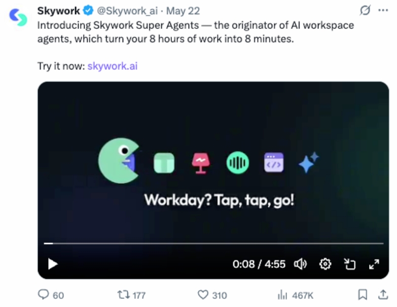 5月22日,昆侖萬維面向全球市場正式發(fā)布天工超級智能體(Skywork Super Agents)網(wǎng)頁端,5月26日正式在中國上線APP。
