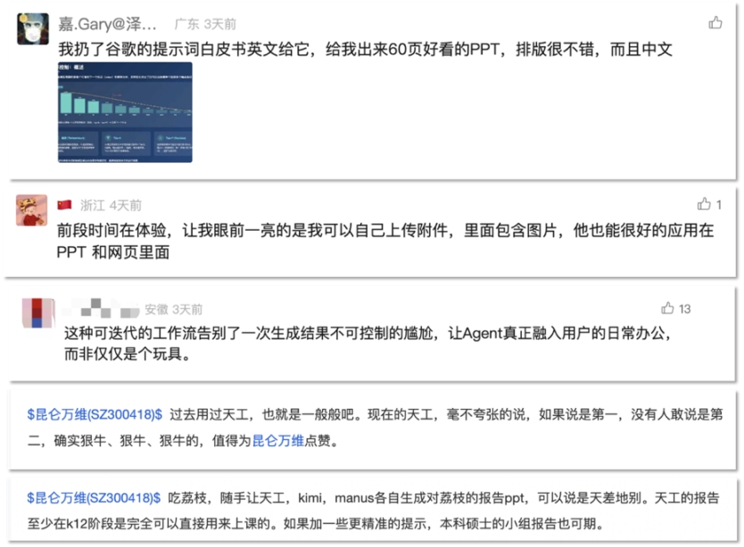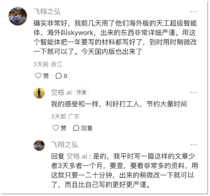 真正體驗過天工智能體的用戶,紛紛感嘆AI帶來了工作生產(chǎn)力的變革,將大家的雙手從工作中的繁雜瑣事中解放了出來,節(jié)約了大量文檔制作、幻燈片生成、數(shù)據(jù)處理的時間。諸多用戶稱贊其為“萬能AI員工”“賽博打工人”“打工人的AI搭子”等。