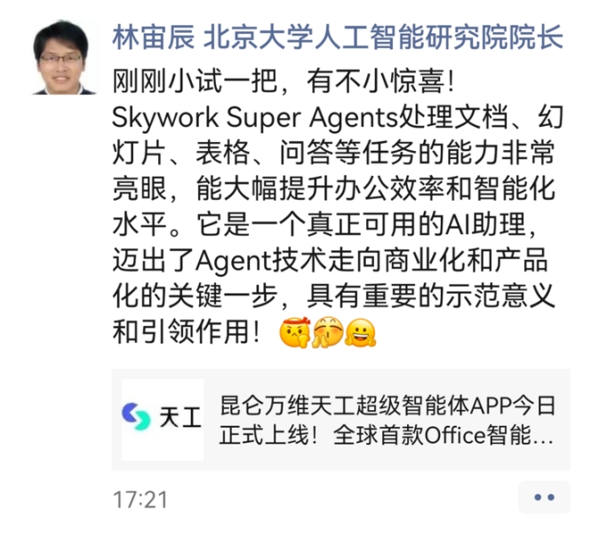 也有來自學(xué)術(shù)界的天工用戶,向我們反饋了最新的使用體驗,包括北京大學(xué)人工智能研究院院長林宙辰教授、清華大學(xué)新聞與傳播學(xué)院/人工智能學(xué)院雙聘教授沈陽。他們不僅贊許天工超級智能體對科研工作產(chǎn)生了積極的效率優(yōu)化作用,也對產(chǎn)品本身的可用性、實用性、商業(yè)性表達了高度認(rèn)可。
