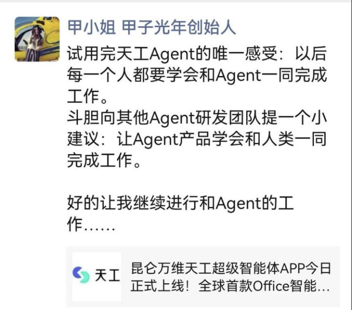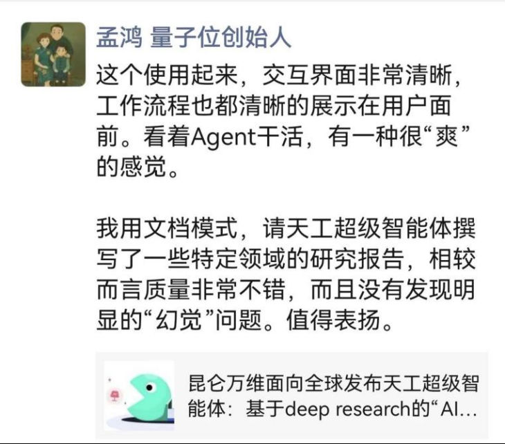 不僅如此,本次天工超級智能體的發(fā)布,在AI媒體圈也受到了大量關(guān)注。量子位創(chuàng)始人孟鴻、甲子光年創(chuàng)始人張一甲,在體驗過后,紛紛稱贊天工的超強功能和實用性。