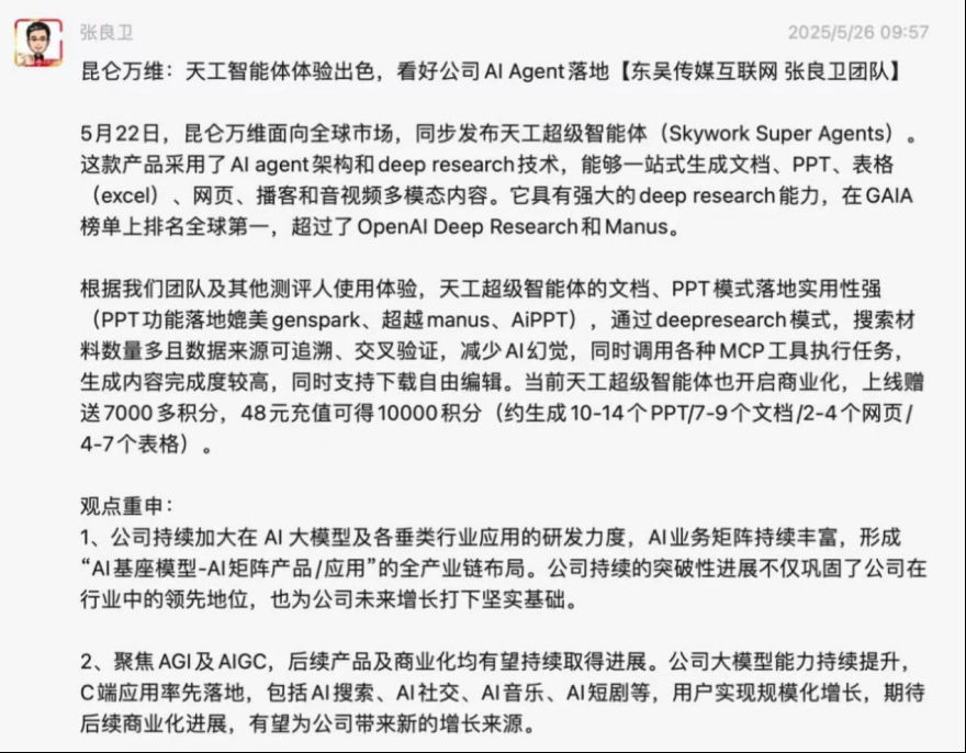 各大研究機構(gòu)也一致看好Skywork Super Agents,東吳證券研究所聯(lián)席所長張良衛(wèi)在其最新的市場點評中提到:“天工超級智能體定位精準(zhǔn),錨定‘文檔、PPT、表格’三大核心智能體賽道,與通用Agent形成差異化優(yōu)勢,快速樹立專業(yè)產(chǎn)品標(biāo)簽。憑借深厚的基座模型與算法積累,它通過極簡提示詞生成高質(zhì)量內(nèi)容、PPT風(fēng)格統(tǒng)一的效果、專業(yè)排版等功能,為項目啟動與成果交付提效賦能,而澄清卡片、數(shù)據(jù)溯源等細節(jié)功能,更彰顯其嚴(yán)謹(jǐn)專業(yè)的產(chǎn)品匠心,是智能創(chuàng)作領(lǐng)域的實力之選。”