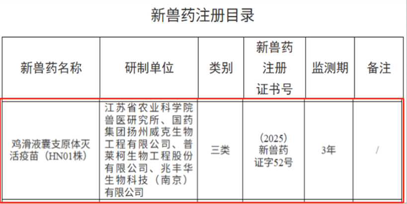 根據《獸藥管理條例》和《獸藥注冊辦法》規定,農業農村部經審查,批準普萊柯與其他單位聯合申報的“雞滑液囊支原體滅活疫苗(HN01株)”為新獸藥,并于2025年6月10日公示了核發《新獸藥注冊證書》(中華人民共和國農業農村部公告第917號)事項。