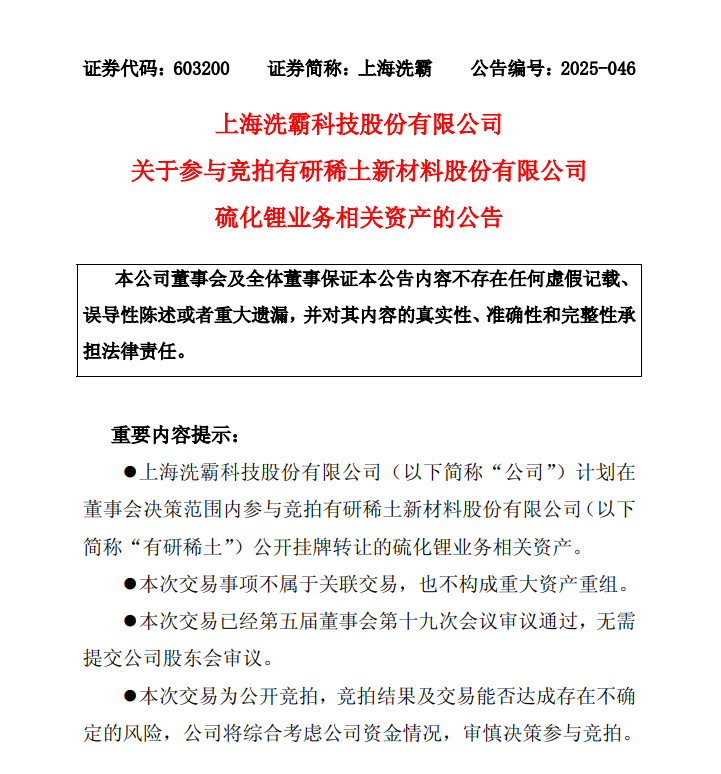 (上海洗霸參與競拍有研稀土硫化鋰業務相關資產公告截圖)